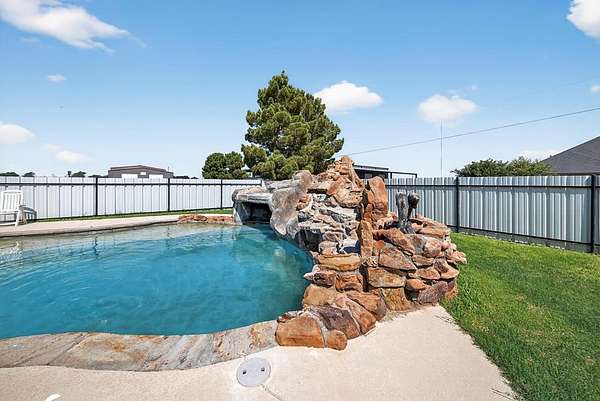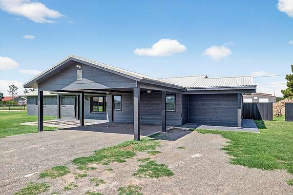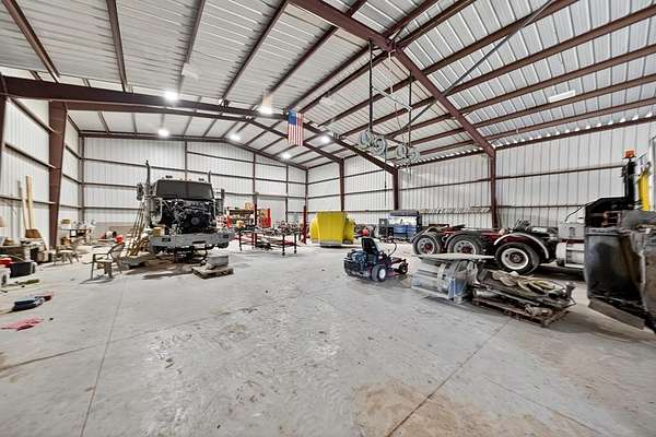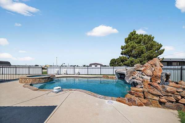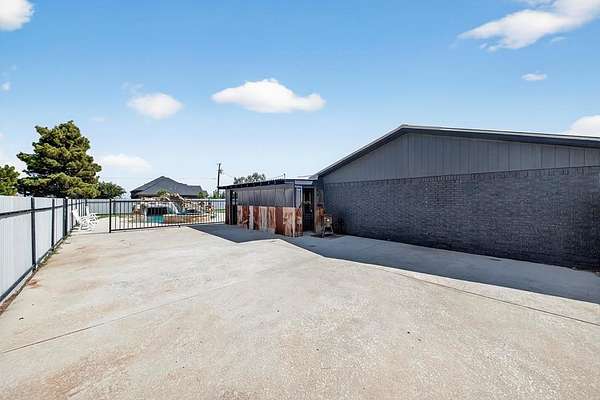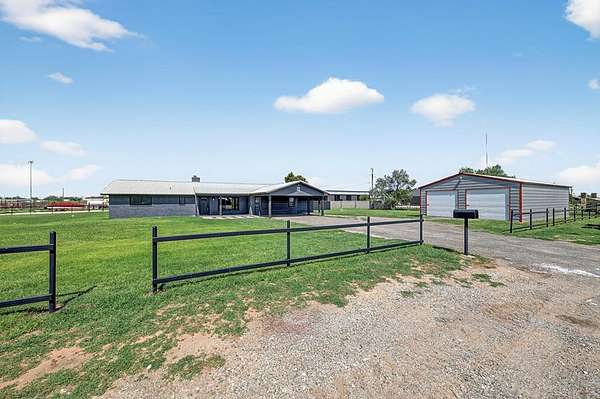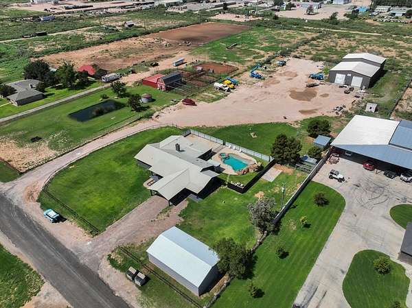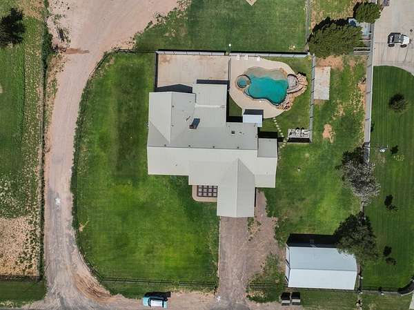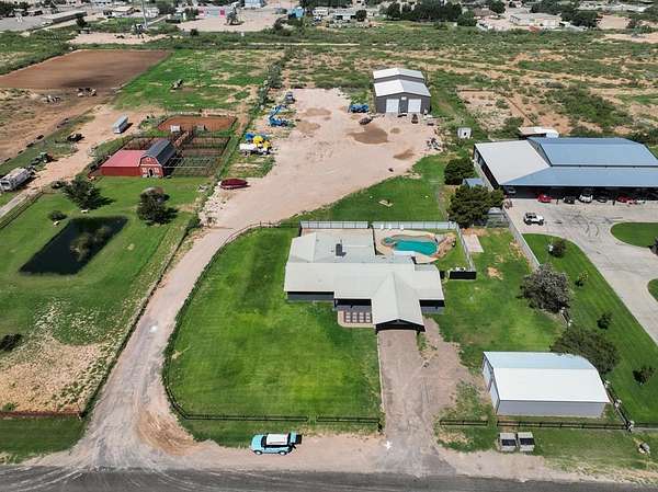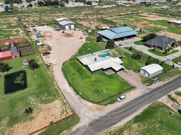 Est $3,617/mo4BR/4.5 BA home on 2.5 acres with 2 primary suites, pool, and large shops. Property includes a 24x40 workshop with electric and a 6,000 sq ft shop with lift, 12' door, 2 roll-up doors, plumbed for a/c & bathroom, oil well disposal. Resort-style pool with hot tub, waterfall, slide, and poolside half bath. Home features new front windows, fresh paint, metal roof, new fans, new septic system, and new water softener. RV hookup with 50-amp service, water, and septic. Additional amenities: chicken coop, dog pen with water/electric, and wiffle/ baseball field.