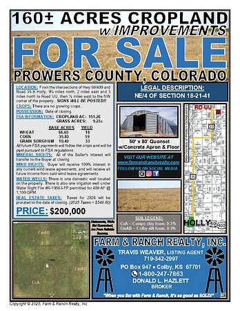 From the intersections of Hwy 50/400 and Road 35 in Holly, 91/4 miles north, 2 miles east and 3 miles north to Road UU, then 1/2 miles east to the NW corner of the property . SIGNS WILL BE POSTED!!