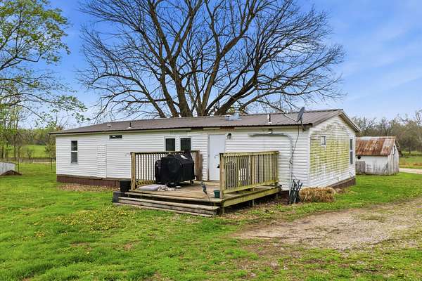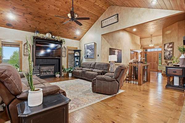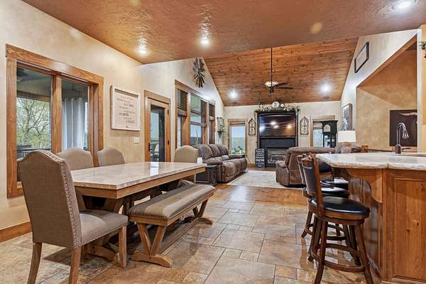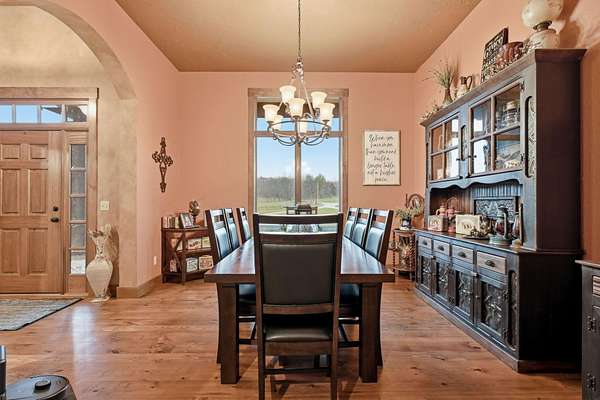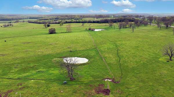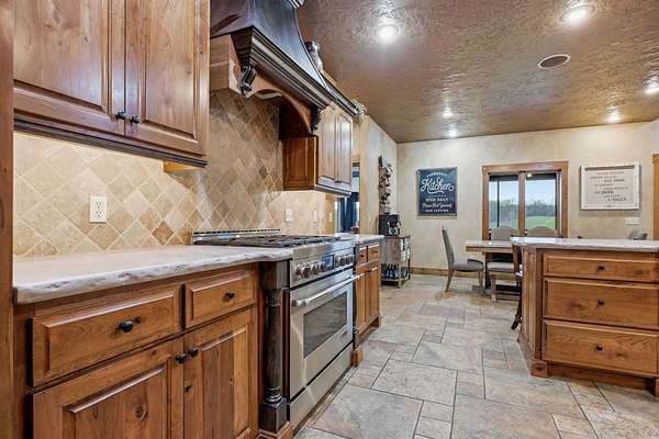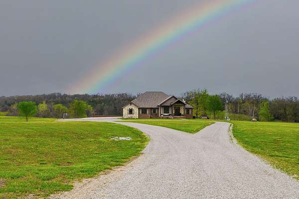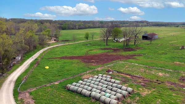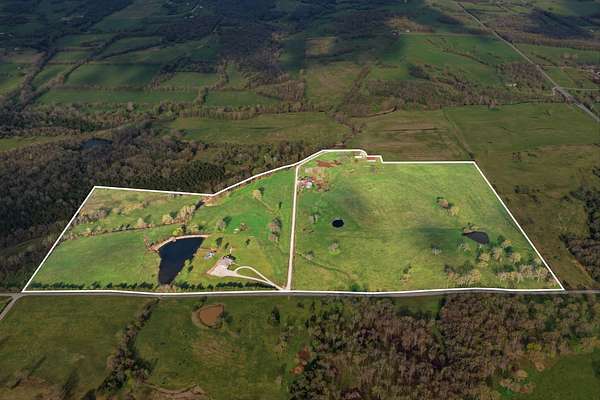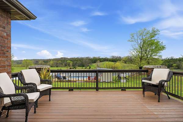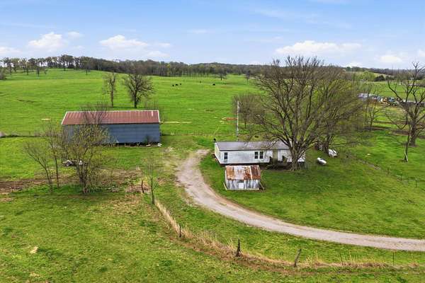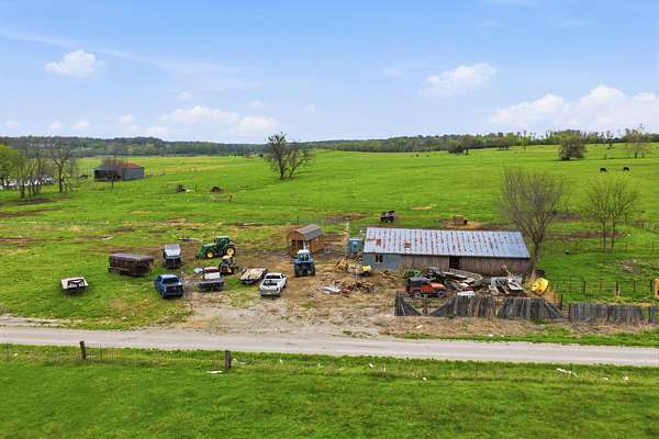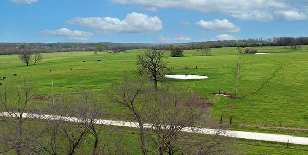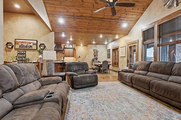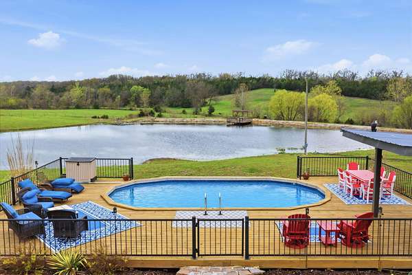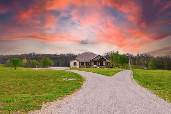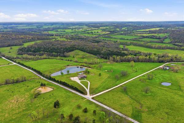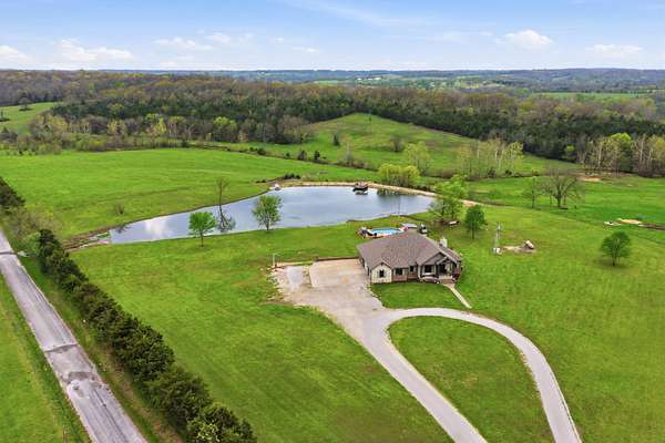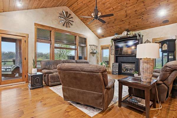 This is a true COUNTRY DREAM on 80 breathtaking panoramic acres! This custom-built Craftsman-style home offers over 4,600 sq ft of living space with 5 bedrooms and 3.5 baths, designed with exceptional attention to detail inside and out.Step inside to find hand-scraped hardwood flooring, knotty alder cabinetry, limestone countertops, tray ceilings, and dual fireplaces (gas and wood-burning). The main level features a spacious living area with cathedral wood ceilings, a stunning kitchen with commercial-grade cook stove, walk-in pantry, sit-down bar, and both formal and casual dining spaces. The primary suite offers a spa-like bath with walk-in tile shower, jetted tub, and oversized closet.The walkout lower level is built for entertaining with an additional living area, wood-burning fireplace, full kitchen, movie theater, storm shelter, and 3 additional bedrooms and 2 baths.Outdoors, this property truly shines--perfect for gatherings and quiet country living alike. Enjoy the outdoor kitchen, fire pit, stamped concrete patio, outdoor shower, basketball area, and a pool with wraparound deck overlooking a fully stocked pond with fishing dock.The land is ideal for livestock with fenced and cross-fenced pasture, two automatic waterers, barn with electric and water, cattle pens, and a machine shed. A 1,200 sq ft double-wide provides additional living quarters or rental potential.Additional features include energy-efficient spray foam insulation and a backup generator for peace of mind.This one-of-a-kind property offers the perfect blend of luxury living and functional acreage--a must see!