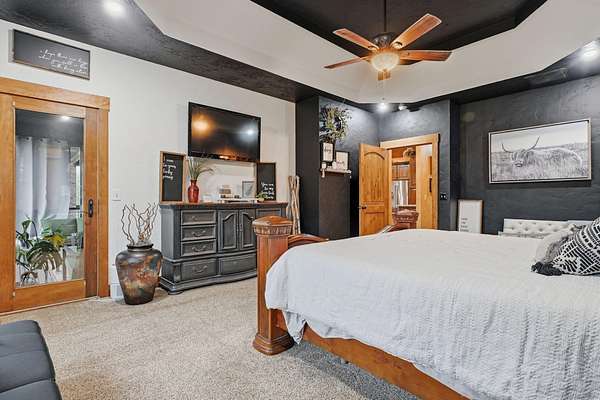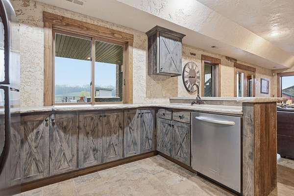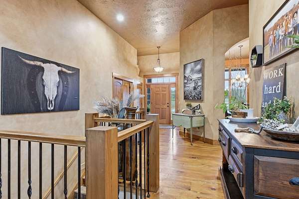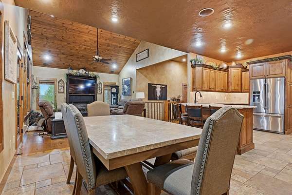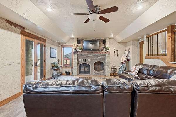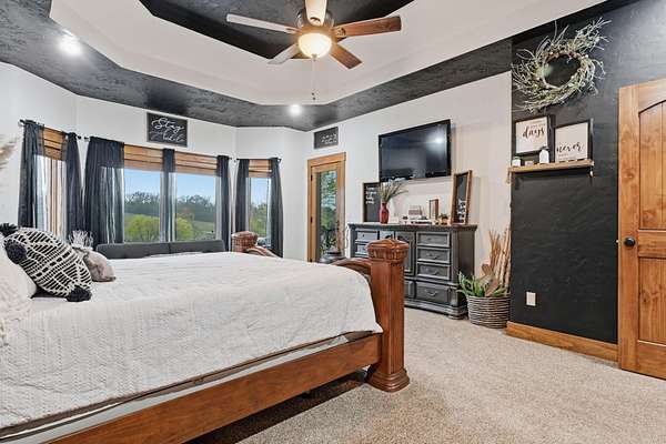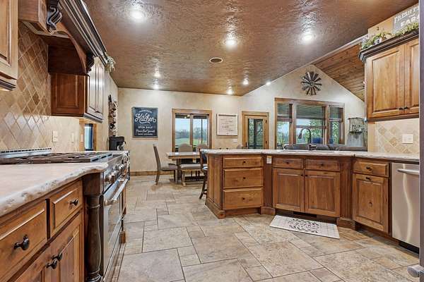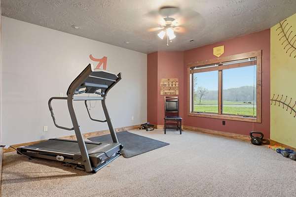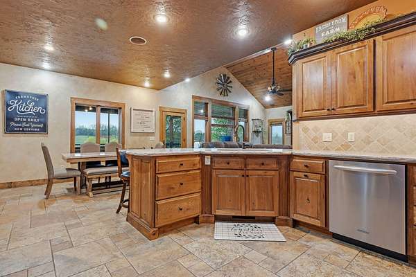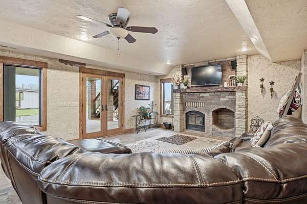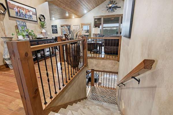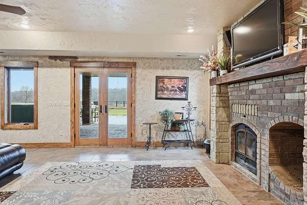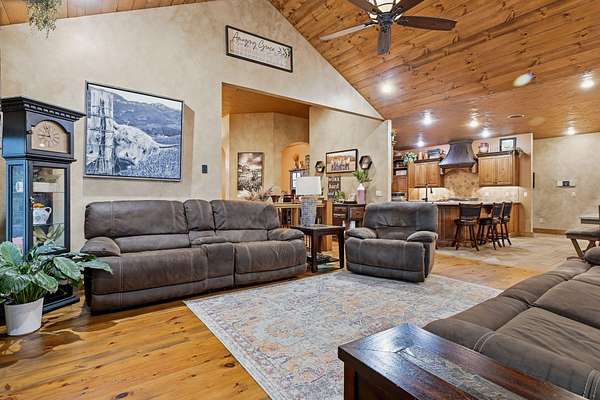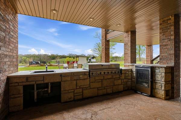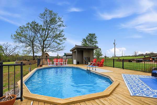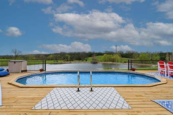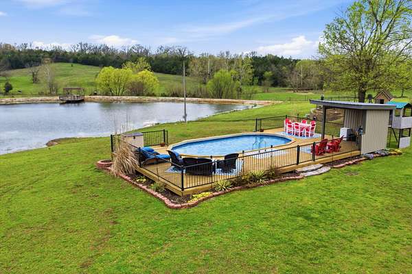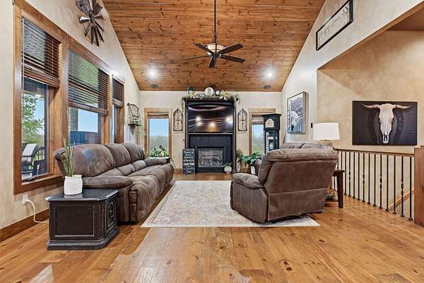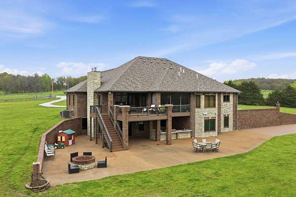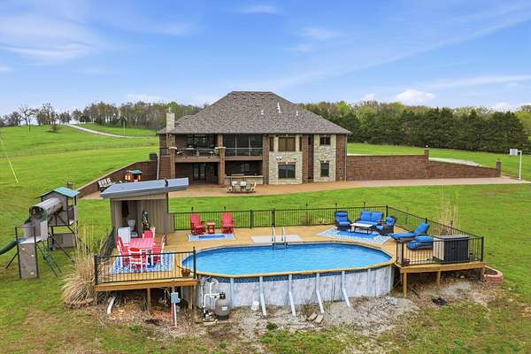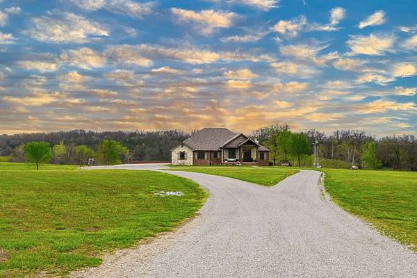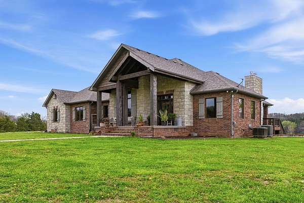 This is a true COUNTRY DREAM on 32 breathtaking panoramic acres! This custom-built Craftsman-style home offers over 4,600 sq ft of living space with 5 bedrooms and 3.5 baths, designed with exceptional attention to detail inside and out.Step inside to find hand-scraped hardwood flooring, knotty alder cabinetry, limestone countertops, tray ceilings, and dual fireplaces (gas and wood-burning). The main level features a spacious living area with cathedral wood ceilings, a stunning kitchen with commercial-grade cook stove, walk-in pantry, sit-down bar, and both formal and casual dining spaces. The primary suite offers a spa-like bath with walk-in tile shower, jetted tub, and oversized closet.The walkout lower level is built for entertaining with an additional living area, wood-burning fireplace, full kitchen, movie theater, storm shelter, and 3 additional bedrooms and 2 baths.Outdoors, this property truly shines--perfect for gatherings and quiet country living alike. Enjoy the outdoor kitchen, fire pit, stamped concrete patio, outdoor shower, basketball area, and a pool with wraparound deck overlooking a fully stocked pond with fishing dock.Additional features include energy-efficient spray foam insulation and a backup generator for peace of mind.This one-of-a-kind property offers the perfect blend of luxury living and functional acreage--a must see!