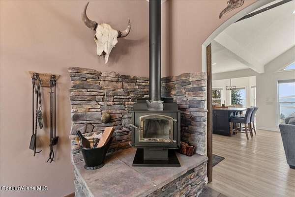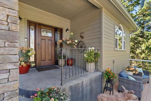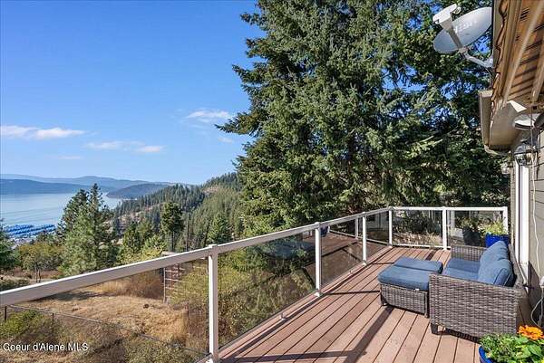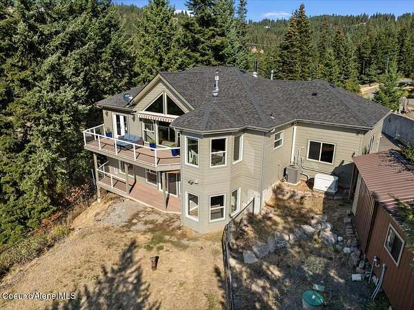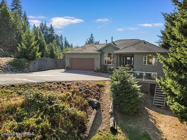 Spectacular Lake Views from private acreage minutes to downtown Coeur d'Alene. Perched above Silver Beach on over 3 serene acres, this 3BD/2.5BA, 2,894 SF home captures unobstructed panoramic views of Lake Coeur d'Alene through expansive walls of windows and an open great room designed to showcase the scenery. The kitchen with island and breakfast bar flows seamlessly for entertaining. Main-floor primary suite offers private balcony access overlooking the lake. Comforts include gas fireplace, wood stove, central A/C, and multiple living spaces. Property features private well w/3,000 gal cistern, septic, whole-house generator, attached 2-car garage, two storage sheds, and landscaped grounds. Enjoy privacy with breathtaking views just minutes from downtown Coeur d'Alene, Silver Beach Marina, The Coeur d'Alene Golf Course, lake access, shopping, and dining.