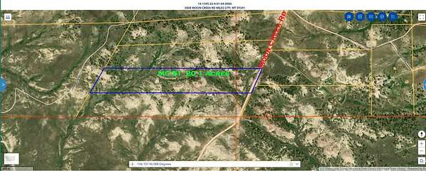 From I-94 Exit 126, south on Moon Creek Road approx. 18 miles to 3808 Moon Creek Rd. Sign along road. Please do not drive on property, but you may walk it; Onx mapping is recommended for finding corners. Corners are marked with T-post & flagging.
