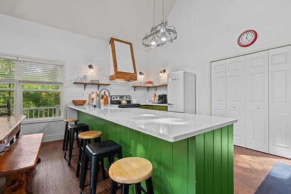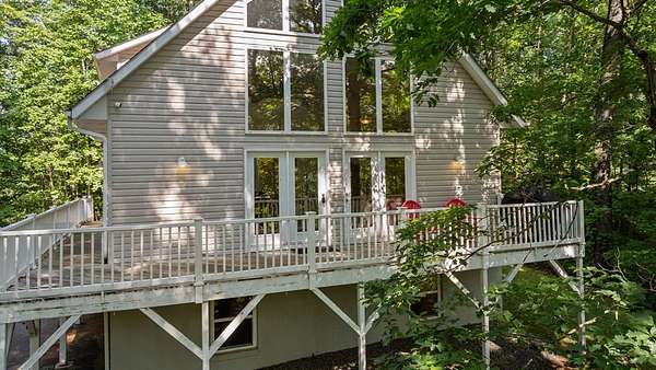 Franklin NC Mountain getaway home. 3 Bedrooms 2 Full baths and a full unheated/unfinished basement which includes a single car garage, laundry area, and workshop/storage. Nearly 360-degree mountain winter views. A wall of windows is in the living, kitchen, dining area which extend upwards to the vaulted ceiling allowing the mountain view inside. Plenty of storage in the kitchen with a spacious pantry plus plenty of countertop space. On the main level there are 2 Bedrooms and 1 Full bath. Upstairs is a large Owners loft en-suite bedroom with a walk-in closet. The loft design lets you enjoy those mountain winter views from the wall of windows. The lower basement level is currently unfinished but has the laundry w/ countertop station, garage, and partitioned workshop/storage space. A Paved driveway leads up to house and lots of graveled parking exists by the home. Park at either basement or main level.