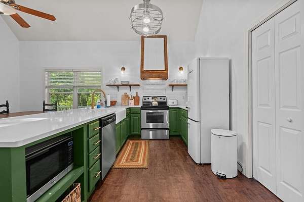 - Cathedral/Vaulted Ceiling, Ceiling Fans, Garage Door Opener, Kitchen/Dining Room, Kitchen/FR Combo, Large Master Bedroom, Living/Dining Room, Open Floor Plan, Pantry, Primary W/Ensuite, Walk-In Closets