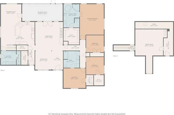 Inside, the main level features a spacious living area with a cozy gas fireplace, two dining spaces, four bedrooms, and two and a half bathrooms. The light-filled living room opens to a screened-in porch with beautiful views of the surrounding property.