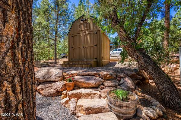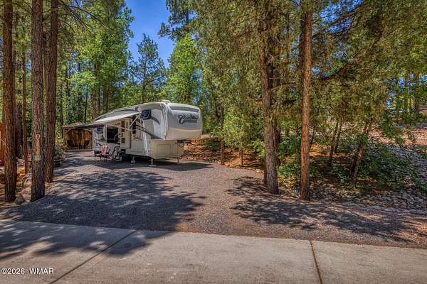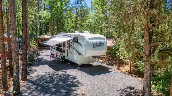 Beautiful corner lot surrounded by tall pines, offering exceptional privacy and one of the largest parcels available in the highly sought-after White Mountain Vacation Village. Situated at approximately 6,300 feet in elevation, enjoy cool summer temperatures and all four seasons in this premier White Mountains community. This well-maintained property features a spacious concrete pad with a covered pavilion complete with pull-down shades for added privacy--perfect for relaxing or entertaining. The lot is thoughtfully landscaped with attractive boulders and low-maintenance rock, creating a clean and natural mountain setting. A storage shed provides additional space for your belongings and could accommodate a washer/dryer setup. There is also a designated parking area for convenience. A well-cared-for 2009 Cardinal fifth wheel is available by a separate Bill of Sale. RV features a recently installed "forever roof," a nice awning, and a recently serviced refrigerator--making this a turnkey getaway. White Mountain Vacation Village offers a variety of amenities, including a clubhouse, pavilion, walking trails, billiards room, laundry facilities, and more. Low quarterly HOA fees cover water, sewer, trash, and road maintenance, giving you access to all community features. Just bring your utilities for electric, internet, and TV. Ideally located with paved concrete streets and central access within the community--this is a rare opportunity you don't want to miss!