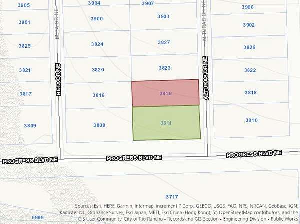 Paseo del Volcan NE to north on Westphilia, then right on Troylyn Rd follow as it becomes Iris Rd, then it becomes Congress Heights Rd, to right on Progress Blvd NE to Alturas Dr. NE. UseLot 18 Lat/Long: 35.321753, -106.609727; Lot 17 Lat/Long: 35.322059, -106.609741
