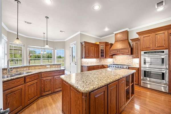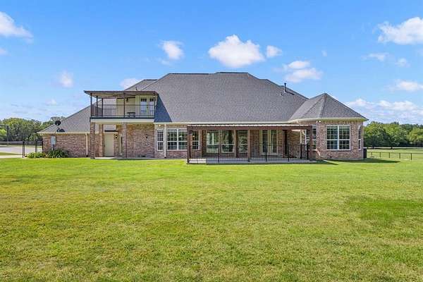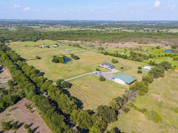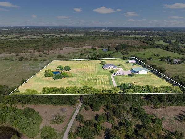 Escape the hustle and bustle of city life with this exceptional custom built horse property, located just 45 minutes from Dallas. Built in 2005, this move in ready estate is set behind a beautiful stone entry with an automatic iron gate, offering privacy, security, and serene country living on nearly 10.5 tree lined acres. Inside the home offers 4 spacious bedrooms, 3 full bathrooms, and 1 half bathroom. It includes two living areas and two dining areas. The impressive kitchen boasts a vaulted ceiling, expansive granite countertops, ample cabinetry, a large island, double ovens, warming drawer and a 6 burner commercial grade gas cooktop. The main living area features hard wood floors and a wood-burning fireplace. The private master suite includes a luxurious bathroom with stone countertops, dual vanities, a jetted tub, and an enormous walk-in shower with dual shower heads. Enjoy the picturesque countryside views from the large, covered patio or the second floor covered balcony during beautiful fall and spring evenings. The home also has an attached 3-car garage. Equestrian enthusiasts will love the 36 x 52 barn with four stalls, a tack room, a wash rack, automatic water, and an 8-foot overhang. Additionally, there's an enormous 50 x 70 detached workshop, which includes an air-conditioned office-bedroom with a nearly finished full bath, a 14-foot door for RV access, two 10-foot doors with automatic openers and with 12 ft overhangs. Perfect for car enthusiasts or running a business out of. The land is fully fenced with a mix of wire and pipe fencing and includes a serene pond with a deck ideal for fishing, relaxing, or simply soaking in the natural beauty. With a roof and gutters that's only five years old, thoughtful upgrades throughout, and plenty of space to roam, this property offers an unmatched lifestyle opportunity. No HOA, No City Tax, AG Exempt, and Caddo Mills ISD! Don't miss your chance to own this exceptional country retreat.