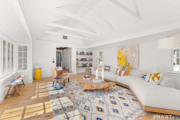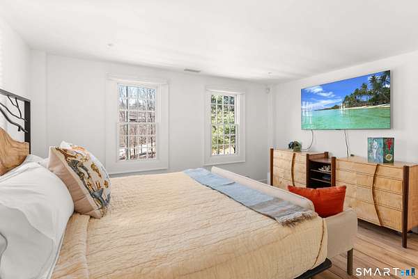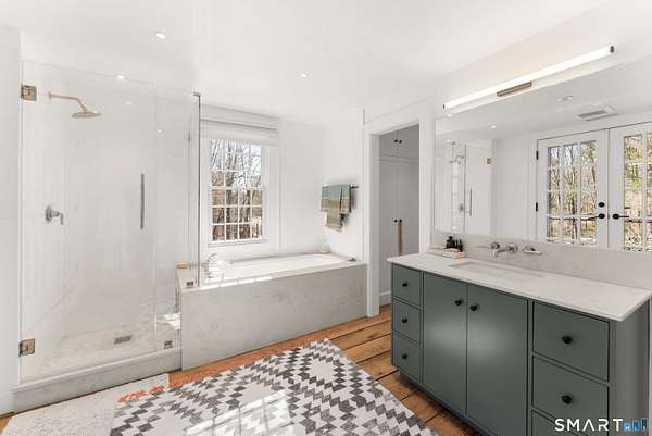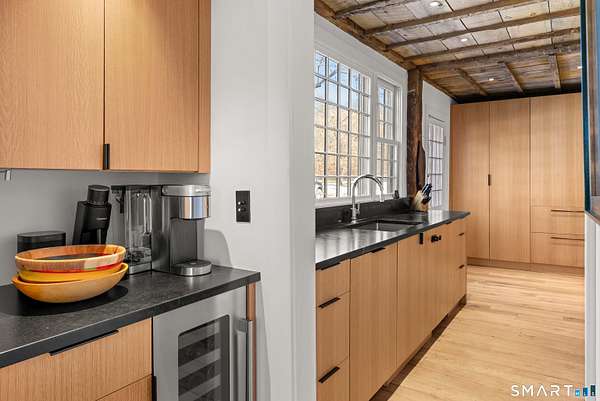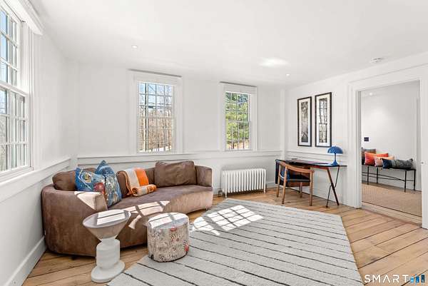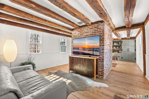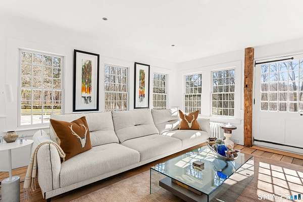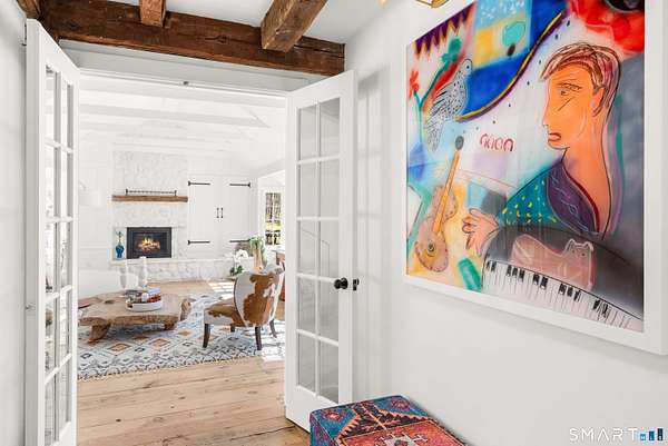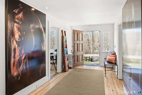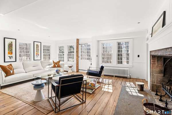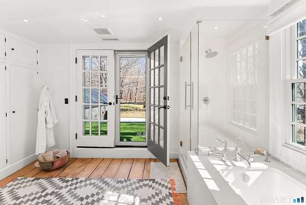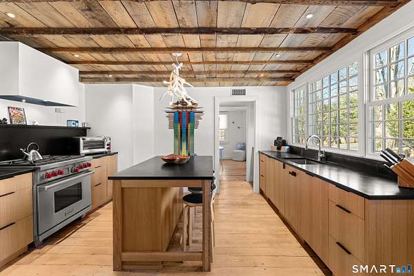 The Jesse Peck Lambert Homestead, built in 1805 & thoughtfully restored, provides a seamless blend of historic charm & modern comfort. Set on 6.42 acres in Northern Woodbury on the Washington border just 2 hours from NYC, this 4-bedroom/3.5-bath home provides a serene escape with timeless appeal. The newly designed kitchen is a chef's dream, featuring custom rift-sawn white oak cabinets, oiled soapstone counters, a Sub-Zero fridge, Wolf 6-burner range & burnished nickel Waterworks fixtures. Every detail has been carefully curated, from soft-close drawers to premium finishes. Historic touches abound, including heartwood floors, an open hearth fireplace with a beehive oven & original millwork with hand-forged cast iron hardware. The primary bath is a spa-like retreat with a cast iron soaking tub, stone surround & custom vanity, while modern updates enhance the other baths with style & practicality. All new custom Anderson 400 Series windows flood every room with light while preserving the home's historic proportions. The large flat property invites outdoor enjoyment with a tranquil pond, mature 200-year-old trees & fenced-in vegetable garden. A restored English barn with a loft, 11-foot custom insulated steel barn doors, insulated and propane-heated garage, floor drains & updated electrical systems provide space for projects, storage, or entertaining.