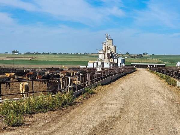 The S & L Cattle, LLC feed yard original home was built in 1910, the feed yard was added at a much later date and is improved with a 15,000-head commercial cattle yard with support facilities on 371.79 acres. The confinement pens are constructed with pipe and cable fencing and have attached concrete feed bunks with concrete bunk line aprons. The drive lanes between the feed bunks are improved with gravel and caliche surface. Each pen has an automatic continuous flow watering system and drainage. The feed yard is enhanced with roads, traffic lanes, a combination hospital and processing barn, and shipping and receiving pens with loading chutes. Additional onsite improvements include the main office building, a machine shed/shop building, a steam flake feed mill with a commodity barn and grain storage improvements, horse pens, storage buildings, two employee dwellings, two water wells plus water storage tanks, a lagoon system for wastewater management, truck scales, cattle scales, and cattle working equipment including a hydraulic chute with an attached custom cattle alley. The CAFO Permit allows for 15,000 head of cattle and 10 horses. The Prowers County economic climate is prime for feeding cattle, with over 35,000 irrigated acres within a six (6) mile radius of the yard. Includes 3 shares of Preferred Lower Arkansas Water Management Association Certificates.