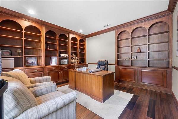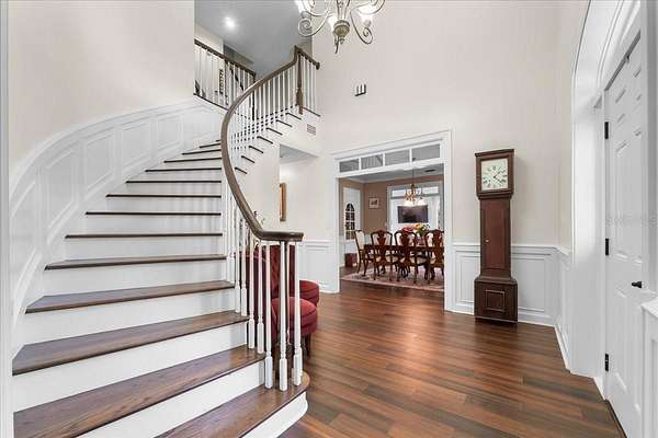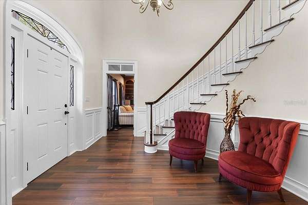 Winter Haven Chain-of-Lakes Executive Home on 1.86 Acres with Lake Eloise Frontage! Welcome to this elegant two-story home nestled on nearly 2 acres in a serene, park-like setting on Lake Eloise. From the moment you step into the grand foyer--with its sweeping curved oak staircase, wainscoting, and a stunning Palladian window--you'll appreciate the timeless craftsmanship throughout. The spacious living room centers around a large fireplace with a custom-designed Georgian mantel and matching built-in bookcases. In the formal dining room, you'll find exquisite built-in cabinets, while the private library features rich, custom cherry wood bookcases. The gourmet kitchen is a chef's dream, complete with a Jenn-Air double ovens, built-in breadbox, appliance garage, and cutting boards--all seamlessly integrated. The kitchen and breakfast area with an expansive 15x31 feet of space, ideal for both cooking and entertaining. Additional features include insulated Anderson casement windows, a dramatic two-story Greek Revival front portico, and wide 4-foot hallways throughout. Thoughtful details such as keystone window headers, dentil molding under the eaves, and decorative quoins on the brick front elevation add architectural charm. Enjoy your heated Infinity saltwater Pool with stunning views of the shaded backyard and Lake Eloise. Practical touches abound, including an underground dog fence, irrigation system, deep well with water conditioning, dual hot water heaters (including one with a heat recovery unit), and a dual-zone A/C system. The interior also boasts a well-equipped laundry room with cabinets, a built-in ironing board, and a laundry chute. Storage is plentiful, with easily accessible closets and attic spaces. Architectural features continue indoors with transom windows above the archways in the dining and living rooms, and a beautiful sunburst elliptical window with sidelights welcoming guests at the front door.