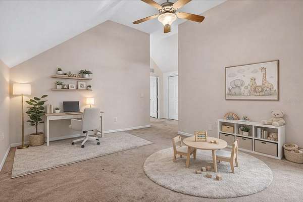 - Ceiling Fans(s), Eat-In Kitchen, High Ceilings, Open Floorplan, Primary Bedroom Main Floor, Solid Surface Counters, Solid Wood Cabinets, Split Bedroom, Thermostat, Walk-In Closet(s)