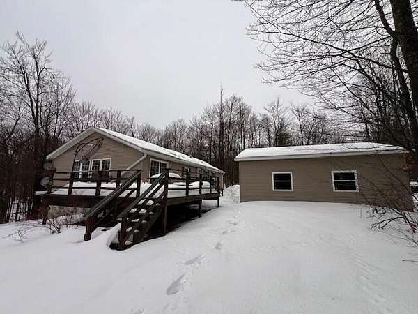 If privacy, acreage, and future potential are at the top of your list, this ranch-style home delivers. Offering 3 bedrooms and 2 bathrooms, the home features an open-concept layout with a smooth flow from the kitchen to the dining and living areas. The walk-out basement boasts higher ceilings and is already plumbed for a third full bathroom, allowing a new buyer to easily customize and finish the space to suit their needs. A large deck extends the living area outdoors, perfect for relaxing or entertaining while surrounded by nature. Situated on approximately 9+/- acres of rolling terrain with mature timber, the property has abundant wildlife including deer, turkey, and small game. The home's central placement on the parcel ensures outstanding privacy and a secluded setting. Across the road, 160 acres of public conservancy land provide even more room to explore and enjoy the outdoors. Fiber optic internet is available at the road. This is truly a must-see property with endless possibilities.