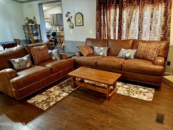 This spacious triplex mobile home features an expansive living area complete with a cozy fireplace-perfect for gatherings Situated on 2.2 acres, the property offers plenty of room to enjoy outdoor living. Inside, you'll find two dining areas ideal for hosting family meals and entertaining guests. The kitchen is thoughtfully designed with a functional island for meal prep, an electric range with air fryer and convection capabilities, and a built-in desk within the cabinetry-perfect for organizing recipes or managing household tasks. Abundant cabinet storage throughout the home provides excellent organization, and the dedicated laundry area even includes a convenient folding space. The primary suite is designed for comfort, featuring a garden tub, double sinks, and ample space to unwind at the end of the day. Add some love and care to make it your own.