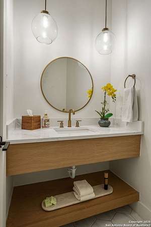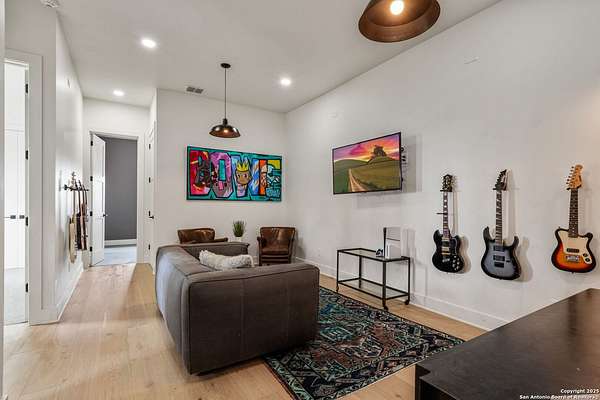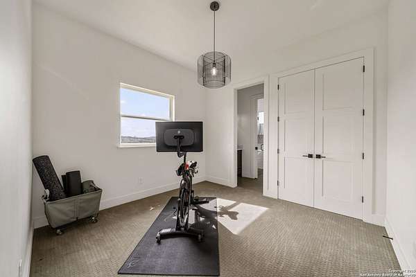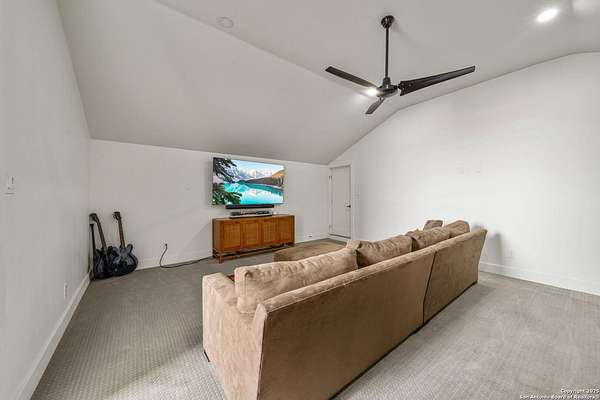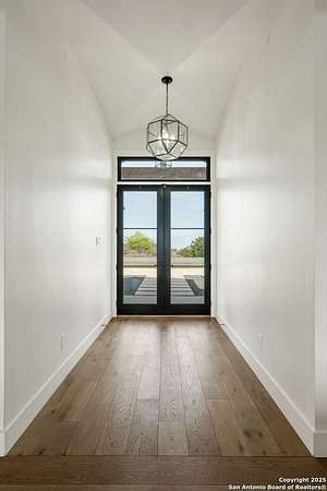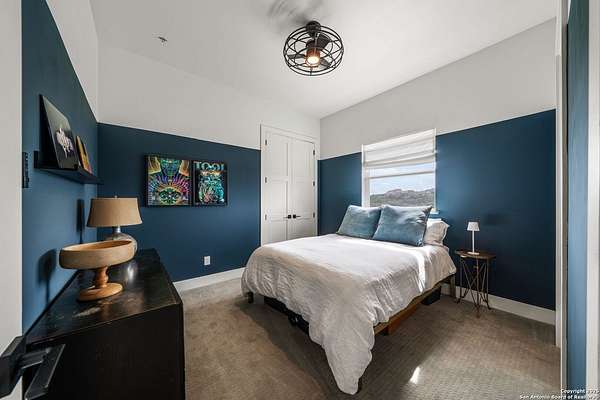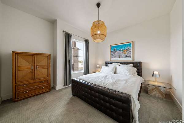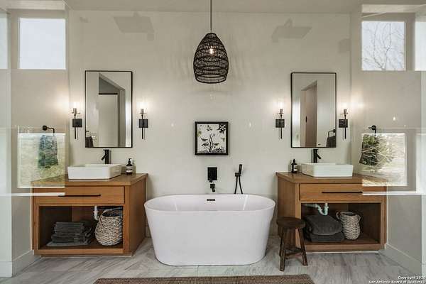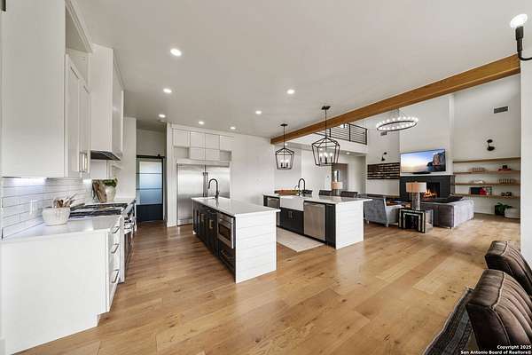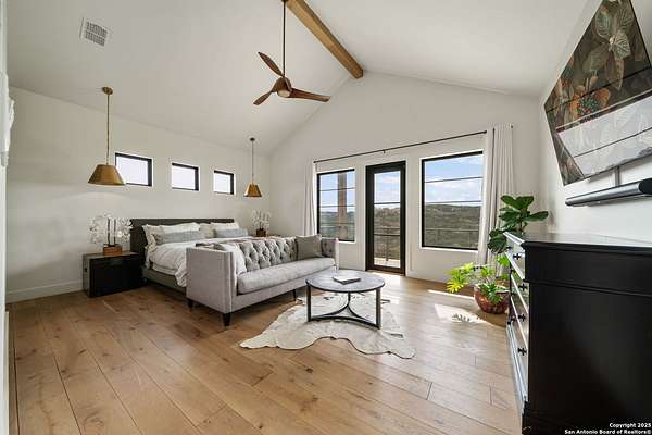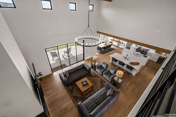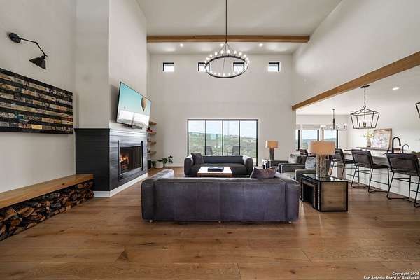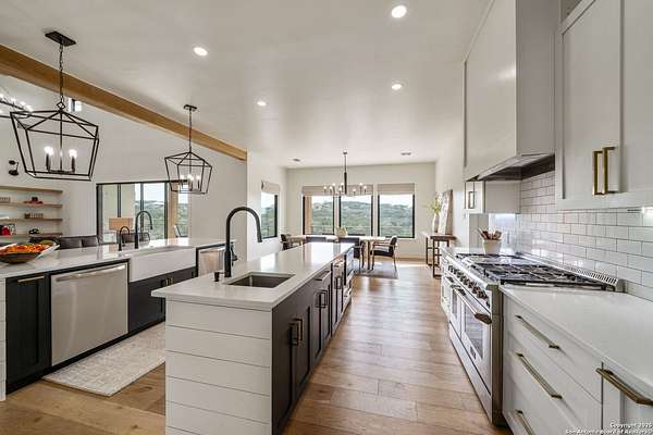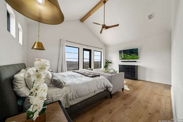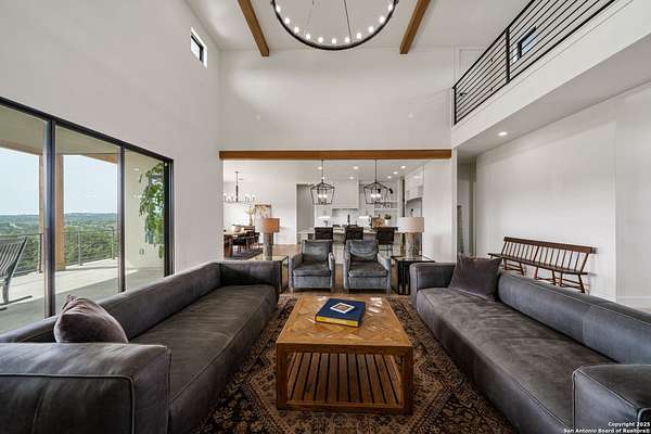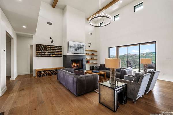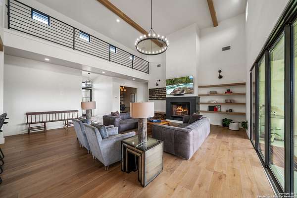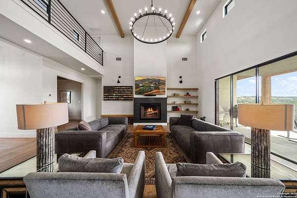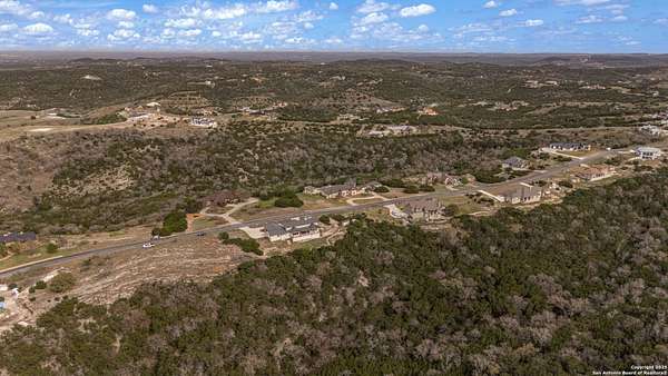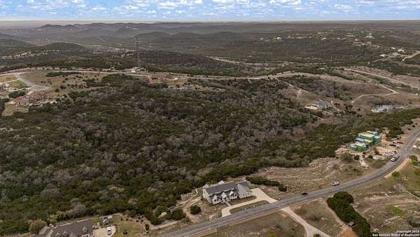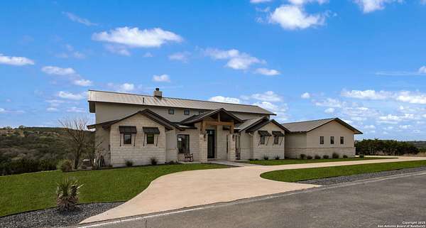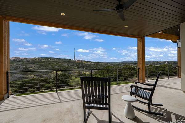 Set on 3.69 acres in the picturesque Texas Hill Country, this exceptional home boasts sweeping, panoramic views and is located within the exclusive gated community of Diamond Ridge in Boerne. This 5-bedroom, 4 full and 2 half-bath residence combines luxury and comfort in a beautifully designed open-concept layout, perfect for entertaining. With a spacious living area featuring soaring ceilings, a grand wood-burning fireplace, White Oak ceiling beams, custom built-ins, and elegant French Oak hardwood floors throughout. Custom and designer wallpaper in office and jack and Jill bathroom. Sliding glass doors lead to a large covered patio, creating seamless indoor-outdoor living ideal for hosting gatherings or simply enjoying the peaceful surroundings and breathtaking sunsets. The large kitchen features a six-burner gas cooktop, farmhouse sink, large dual islands with room for seating, and custom soft-close wood cabinetry. A large dining area surrounded by picture windows frames the spectacular views. The primary suite is a serene retreat with room for a cozy sitting area and direct access to the back patio. The ensuite bathroom features a walk-in shower with dual shower heads, a freestanding tub, dual White Oak vanities, and a spacious walk-in closet with built in shelving. A bonus space can be used as a second living area, home gym, or craft room. Upstairs, a generous game/theater room with wet bar and half bath offers the perfect space for movie night or entertaining friends. Diamond Ridge residents enjoy exclusive access to a private lake with a fishing dock, pavilion, and basketball and tennis courts. Zoned in top-rated Boerne ISD and just a short drive from historic downtown Boerne, this home offers a resort-style lifestyle in a private, tranquil setting.