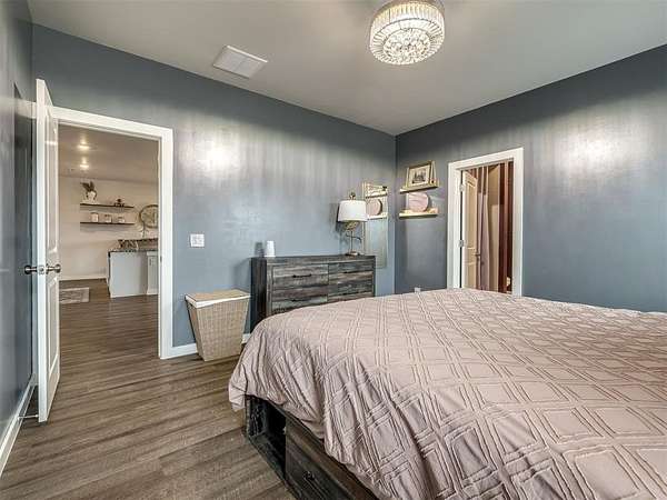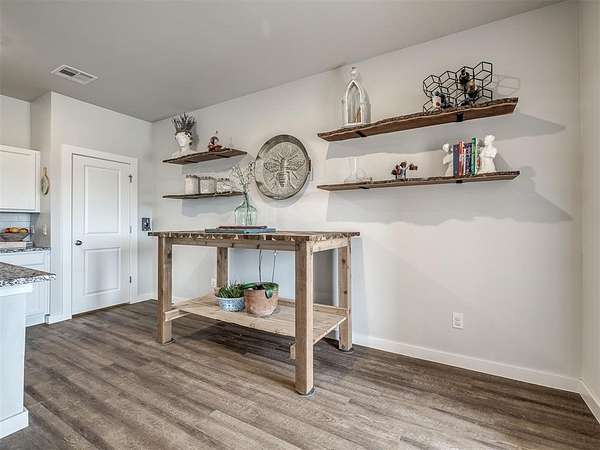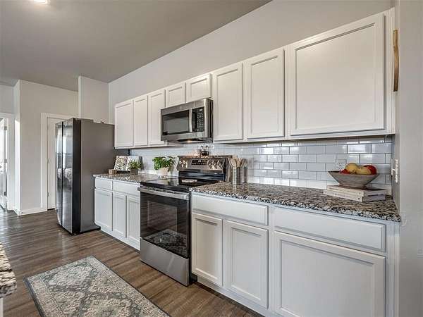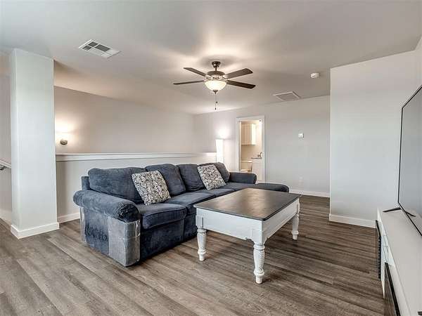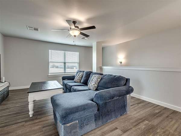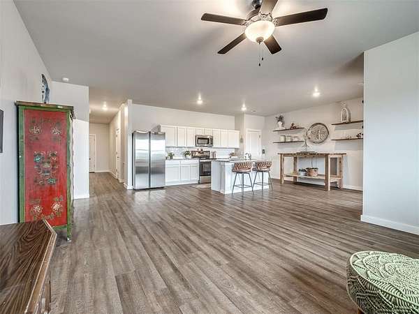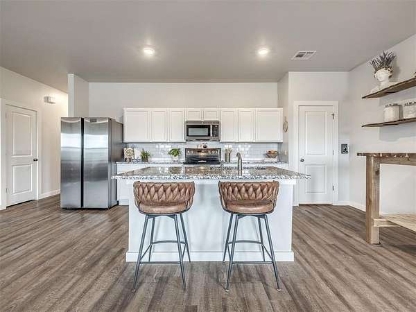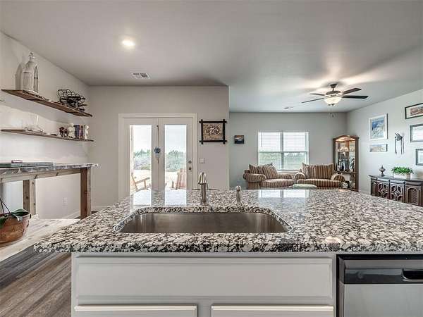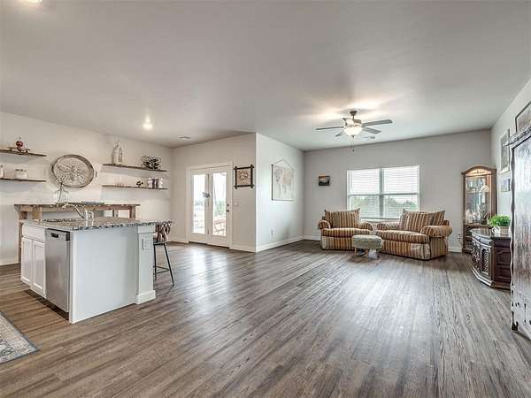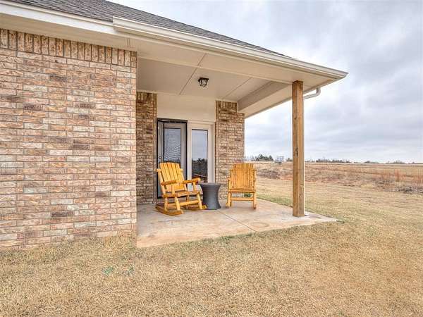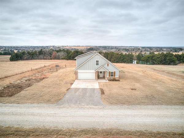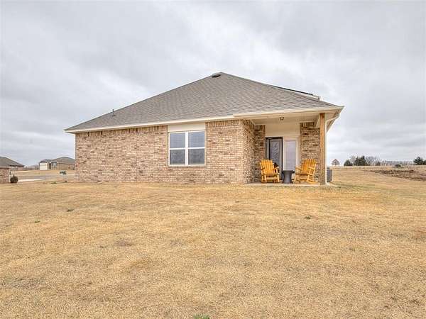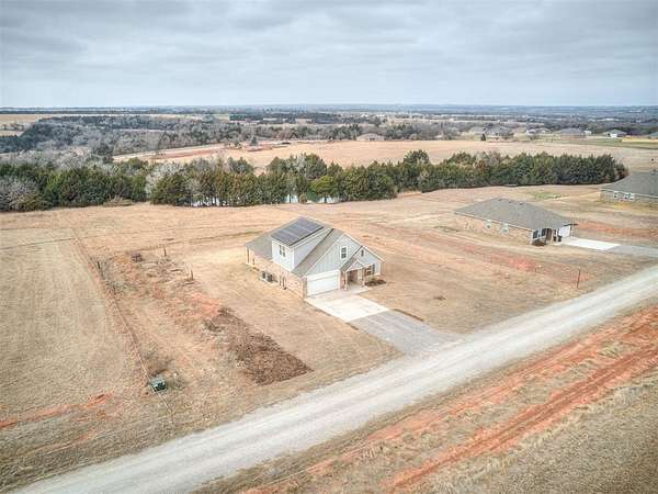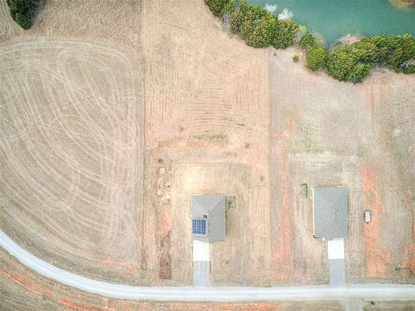 Better than new and sitting on 1.81 acres with a beautiful water view, this 4 bed, 3 bath home offers space, style, and energy efficiency. The property includes ownership of a portion of the pond, creating a peaceful setting you can enjoy right from your own backyard. Built in 2025 and offering 2,144 sq ft, the home features luxury vinyl plank flooring throughout the entire home, including all bedrooms - a rare and highly desirable upgrade. The spacious living area flows seamlessly into the kitchen, creating an ideal layout for everyday living and entertaining. The kitchen features granite countertops, sleek subway tile backsplash, stainless steel appliances, a breakfast bar, large eat-in dining area, and an oversized walk-in pantry with excellent storage space. The primary suite is generously sized and includes a private ensuite bathroom and walk-in closet. Two secondary bedrooms are located on the main level and share a full bathroom. Upstairs you'll find a large bonus room along with the fourth bedroom and an additional full bath, making it a perfect setup for guests, a game room, or a private retreat. The seller has also added solar panels that provide impressive energy savings, along with an 8-10 person above-ground STORM SHELTER rated for an F5 tornado, offering both efficiency and peace of mind. These valuable upgrades are already in place - benefits you typically wouldn't get with new construction homes in the neighborhood. If you've been looking for a newer home with acreage, water views, and thoughtful upgrades throughout, this one is a must-see.