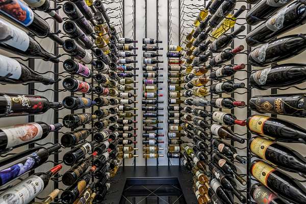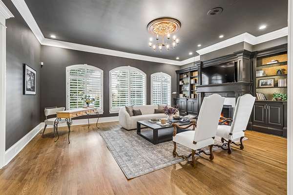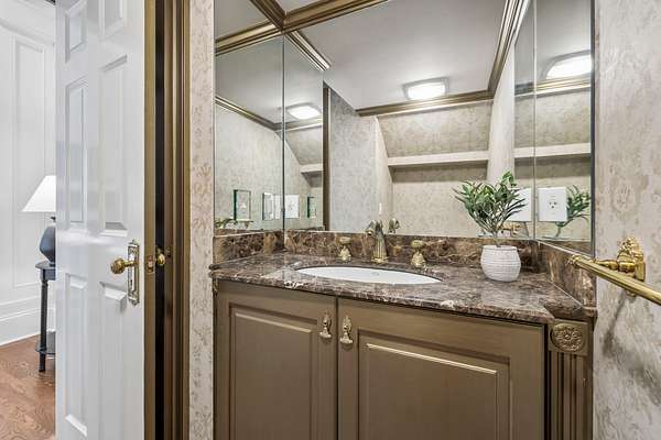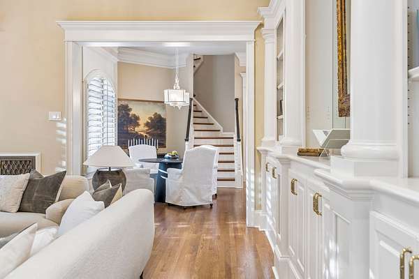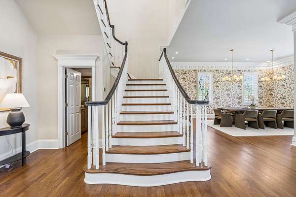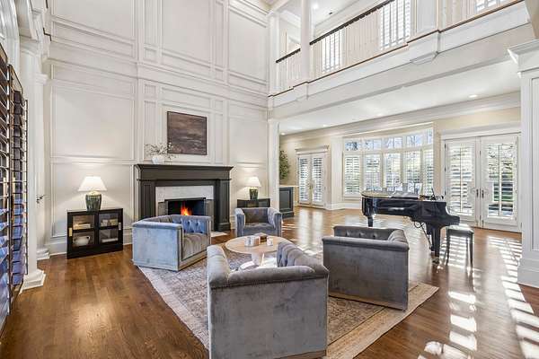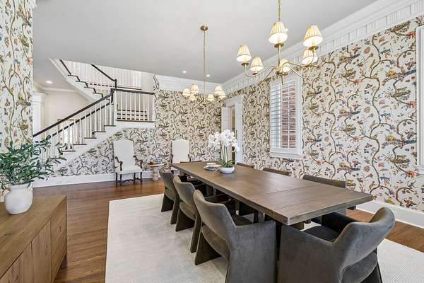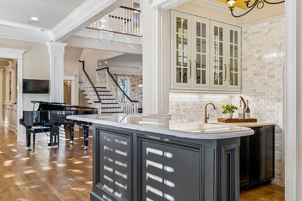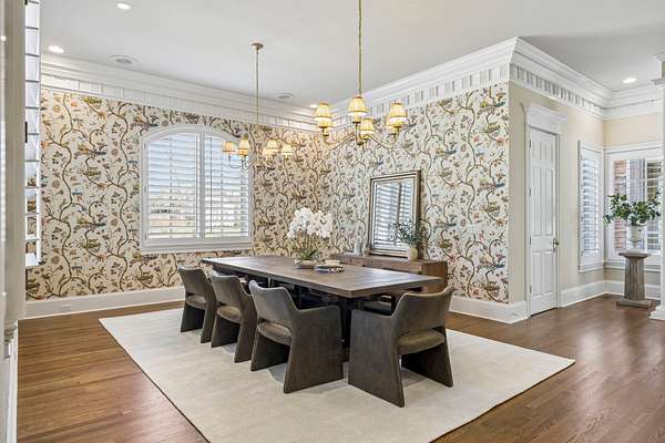 Designed with entertaining at its core, the home unfolds with a sense of scale and warmth, anchored by a dramatic two-story great room with soaring 22-foot ceilings. Natural light pours through French casement windows, creating an inviting backdrop for both intimate gatherings and larger celebrations. The formal dining room, wrapped in designer House of Scalamandré wallpaper, makes a striking statement, while a fully equipped wet bar—thoughtfully positioned off the foyer and adjoining piano room—alongside an impressive temperature-controlled wine room, sets the stage for curated evenings at home.