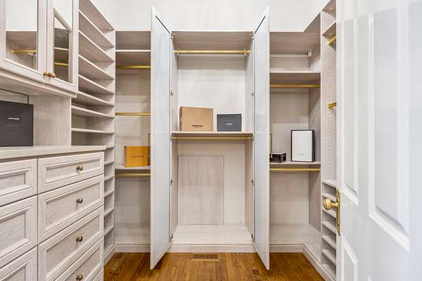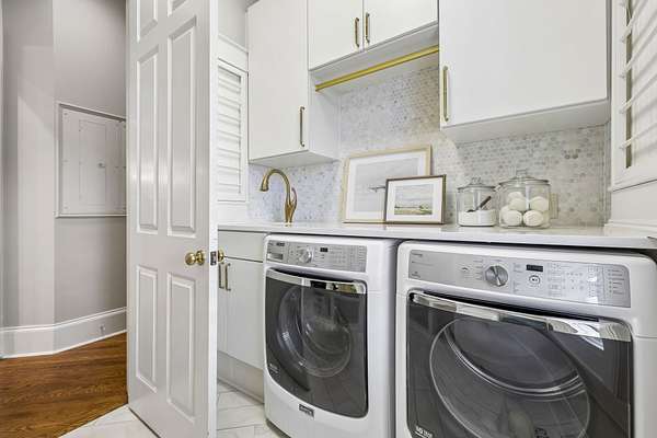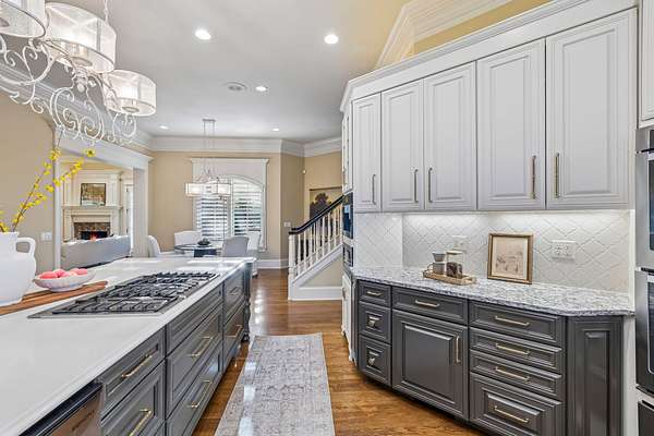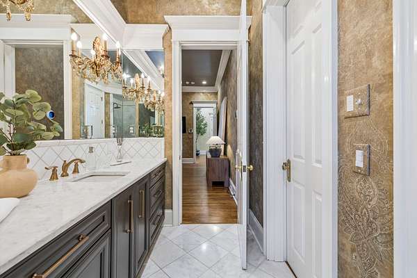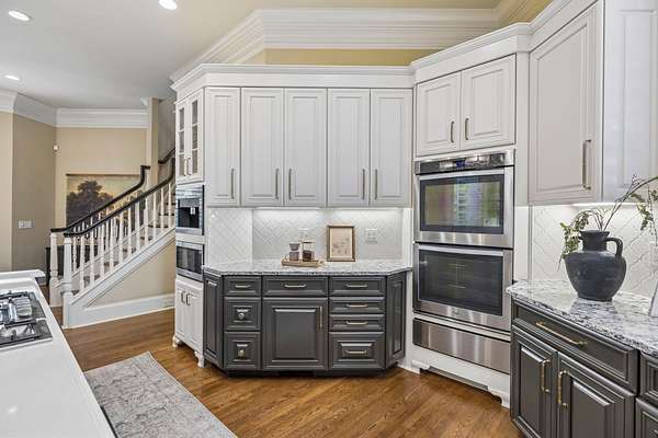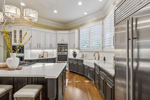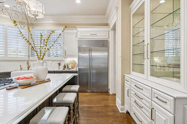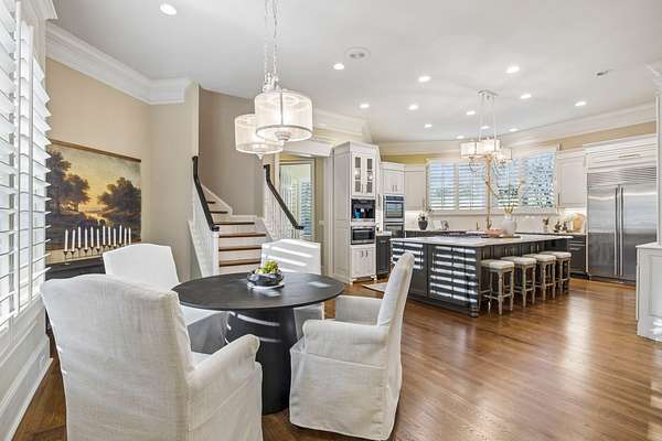 The kitchen is both refined and functional, centered around a 10-foot quartz island and complemented by premium appliances including Sub-Zero, Bosch, Miele and more. Thoughtful details like parlor doors, a built-in china cabinet and a cozy breakfast nook create a space that feels as beautiful as it is practical.