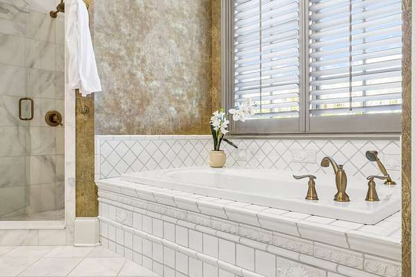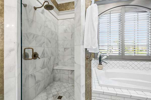The main-level living spaces offer versatility and privacy, from a richly appointed library with fireplace to a light-filled den that opens directly to the outdoor living areas. The primary suite is a true retreat, featuring a spa-like bath with heated marble floors, soaking tub, walk-in shower and dual closets designed for everyday luxury.