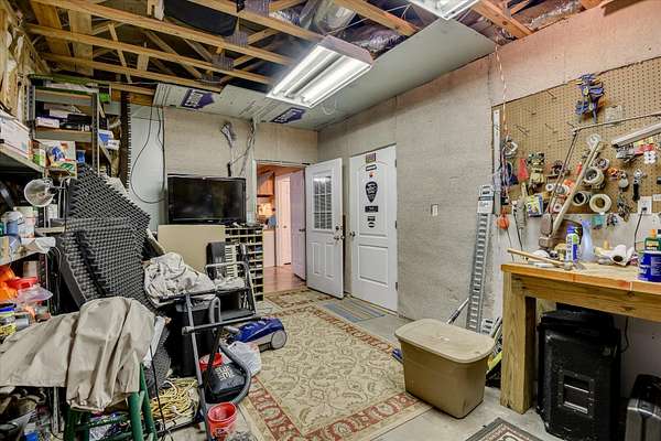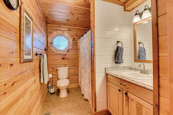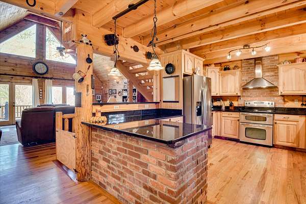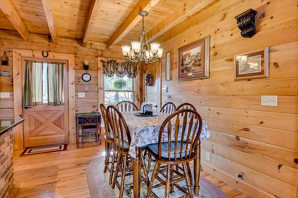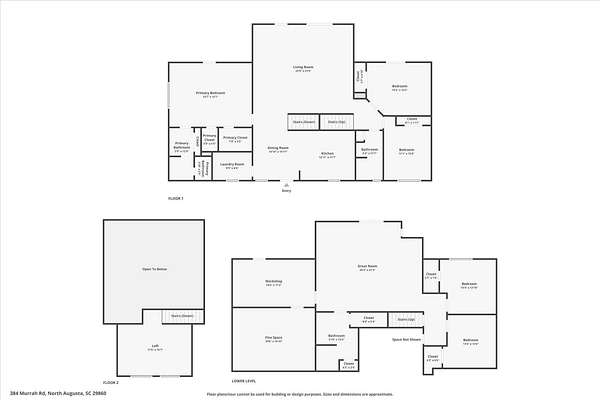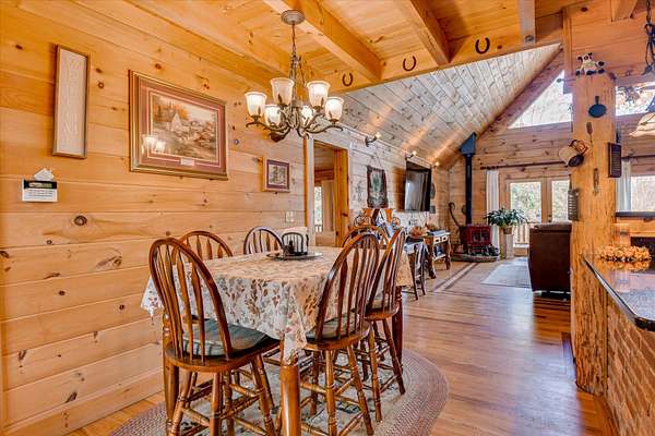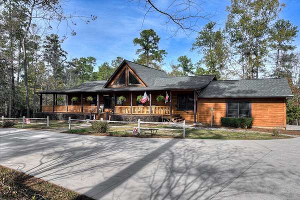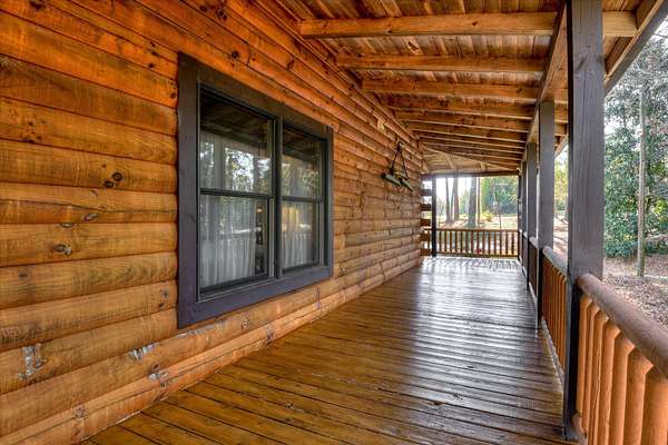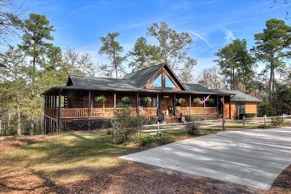 Experience the timeless beauty and craftsmanship of this exceptional custom log home, offering over 3700 square feet of finished living space with approx. 450 sq ft of partially finished storage space/ flex space. Nestled on two private, wooded acres with beautiful stone walkways, this residence welcomes you with a grand wraparound porch, and two-tiered decking perfect for outdoor entertaining, with a spacious detached workshop. Ideally located in North Augusta, just minutes from both Aiken and Augusta, this property combines rustic charm with modern convenience. Constructed from solid white pine logs, the home features impressive property-sourced wood beams and locally reclaimed brick tiles in the kitchen, creating a unique blend of natural textures. The gourmet country kitchen showcases custom hickory cabinetry, sleek black granite countertops, and enduring quality. Throughout the home, you'll find beautiful white pine floors and tongue-and-groove ceilings. The expansive, vaulted living room is flooded with natural light from picture windows and centers around a stately Leyden cast iron wood-burning stove set on a dramatic stone hearth. The thoughtfully designed split-bedroom floor plan features a spacious primary suite with a comfortable en suite bathroom, complete with tiled flooring and shower. On the opposite wing, two inviting guest bedrooms and a well-appointed guest bath provide comfort and privacy for family or visitors. An upper-level loft offers more picture windows for a versatile retreat, ideal for a home office, reading nook, or play area. A striking cedar tree cut on site, accentuates the staircase leading to the finished walk-out basement, where you'll discover two additional guest bedrooms, an expansive den with a convenient kitchenette, and a combined bathroom and laundry area. Two generous storage rooms provide ample space for hobbies, currently used as a music studio and workshop. Additional highlights include a brand new roof (2025), a dedicated utility closet for easy access to home systems, a comprehensive whole-home water filtration system, and an oversized 84-gallon water heater for enhanced comfort and efficiency. Outside enjoy a large detached workshop/ garage perfect for the car hobbyist or craftsman or additional storage for recreational vehicles.