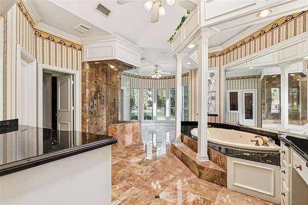 - Built-In Features, Built-In Wine Cooler, Cable TV Available, Chandelier, Decorative Lighting, Double Vanity, Eat-In Kitchen, Flat Screen Wiring, Granite Counters, High Speed Internet Available, In-Law Suite Floorplan, Kitchen Island, Multiple Staircases, Natural Woodwork, Open Floorplan, Paneling, Pantry, Second Primary Bedroom, Sound System Wiring, Vaulted Ceiling(s), Wainscoting, Walk-In Closet(s), Wet Bar