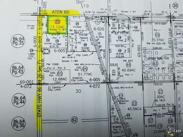 City of Imperial, Ca. Calling Investors & Developers. 12.2 acres M/L of Prime Location. Zoned General Commercial which offers multiple uses. Approx. 762 Feet Fronting Aten Road. Area along one of the more heavily traveled corridors of the Imperial Valley, Just off the South Easterly Corner of North Imperial Avenue and Aten Road. Vibrant community of Imperial is surrounded by area Single Family Residents, Schools, Healthcare, Shopping, Large Retail Outlets, Hotel, Restaurants, Banks, Imperial County Airport and the Imperial County Fairgrounds. Property used to be the old area drive inn. Property Sold "As-Is". Seller and/or agent make no warranties except as to Title. Buyer to do their own due diligence to satisfy themselves.