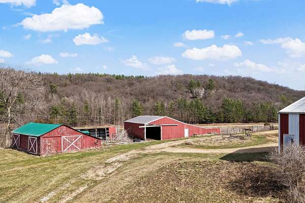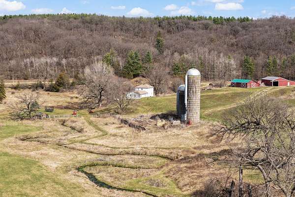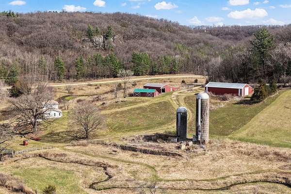 DRIFTLESS GEM-Welcome to this charming historic farmhouse. Nestled in a beautiful valley, this 44 acre farm features an updated home, a spring-fed class II trout stream, fenced pasture and tillable land plus three outbuildings, including a large machine shed. Set on a quiet country road, this property offers both peace and opportunity 40 minutes from Madison. A 6.5 acre fenced pasture + creek is ready for animals. Newer windows fill the home with natural light, wood stove + gas heat + AC make this home up to date. New roof + LP siding installed in Oct 2023 provide long lasting protection. The remodeled kitchen is the mainstay on the first floor with updated style + functionality, while the one bedroom apartment over the attached 2-car garage offers rental income, guest quarters or more room. A platform deck to set up camp under the Oaks. This is it— an exceptional combination of usable farmland, + updated home in a picturesque setting in one of Wisconsin's most sought-after regions.