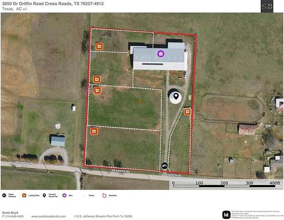 Discover this exquisite 5+ acre Barndominium, nestled in the picturesque city of Cross Roads within the highly desirable Aubrey ISD. Ideally located just off Hwy 377, north of Hwy 380, on Dr. Griffin Rd., this property features a gently rolling landscape and sandy loam soil, perfect for horses, livestock, and cultivating verdant pasture grass. Take in sweeping pastoral views to the north, along with a captivating glimpse of downtown Denton. The property is equipped with a 60 x 200 covered arena, 8 spacious 14x14 stalls, and a fully outfitted workshop, along with numerous other amenities designed for equestrian enthusiasts. The Barndominium itself includes 3 bedrooms and 1 bathroom, offering potential as a rider lounge or guest house. Additional highlights include a covered round pen, 5 loafing sheds, and an RV hookup. The property is securely fenced and cross-fenced with pipe and cable fencing, ensuring the safety of your animals. The seller is open to considering OF with a substantial down payment, making this an exceptional opportunity you won't want to miss! Build your dream home on this stunning acreage, conveniently located near the Dallas-Fort Worth Metroplex.