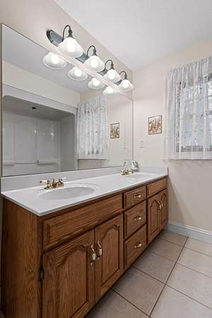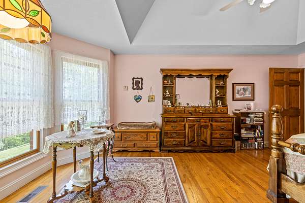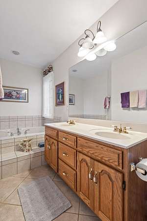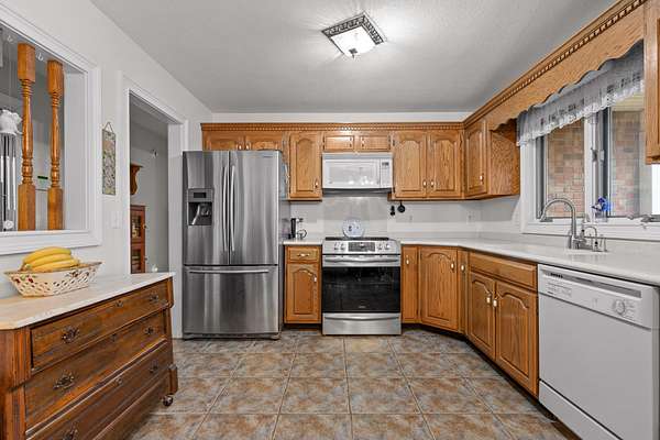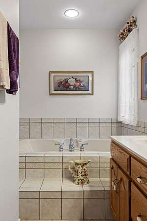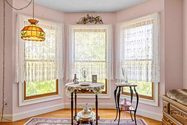 The kitchen is both functional and timeless, featuring custom oak cabinetry, generous prep space, and Corian countertops. The private primary suite offers a sitting area, bay window views, oversized walk-in closet, and a spa-like en-suite with whirlpool tub, separate shower, and dual vanities.