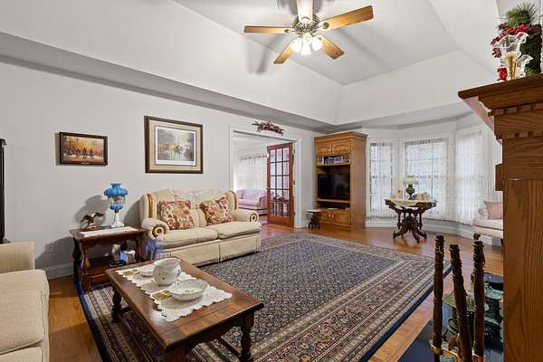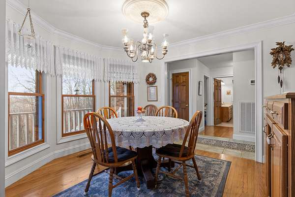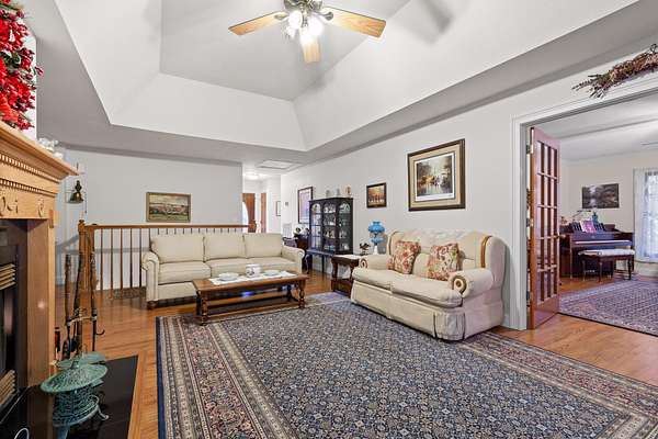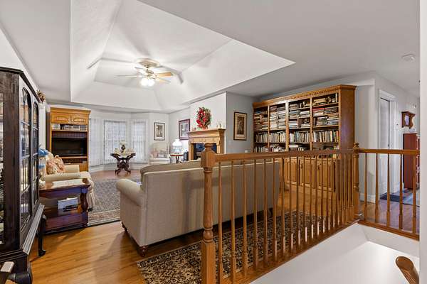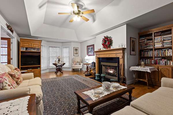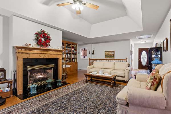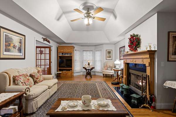 Step inside to an inviting, open layout where a stunning dual gas/wood-burning fireplace anchors the great room, highlighted by tray ceilings and warm natural light. The adjoining family room and dining area--framed by picturesque bay windows--capture sweeping mountain and wooded views.