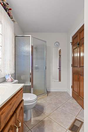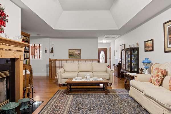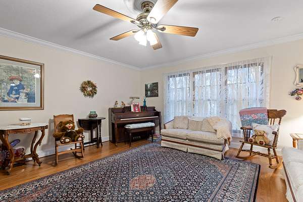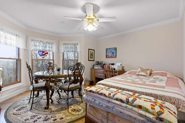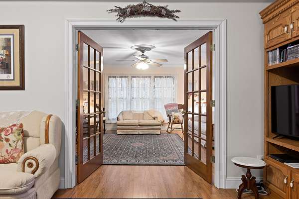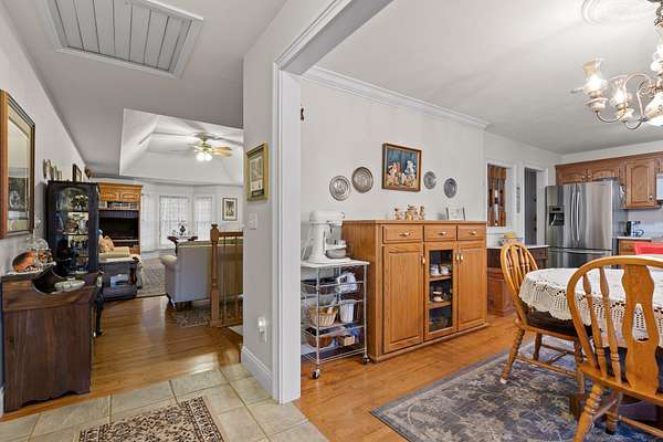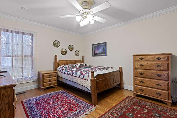 Two additional bedrooms provide space and charm, with shared access to a well-appointed bath. Thoughtful details include crown molding, 36'' doorways for accessibility, and main-level living. A full basement with 12-14 ft ceilings, fireplace, and full bath offers endless expansion potential.