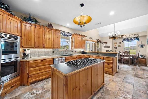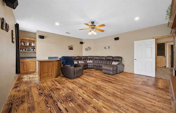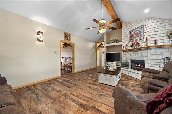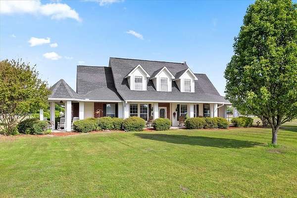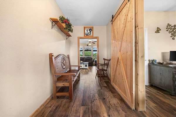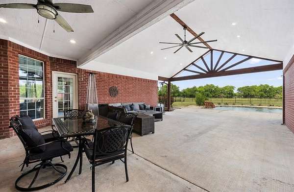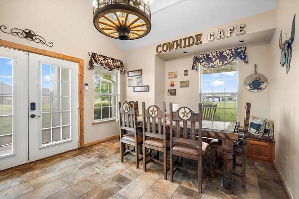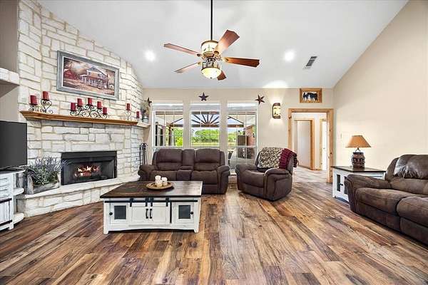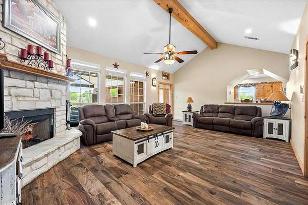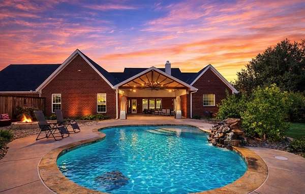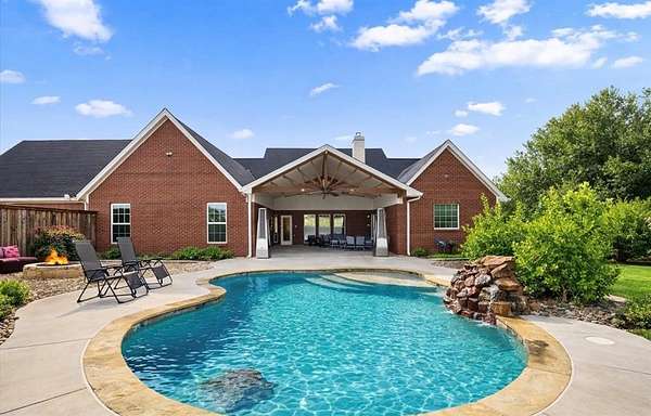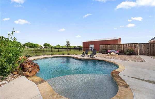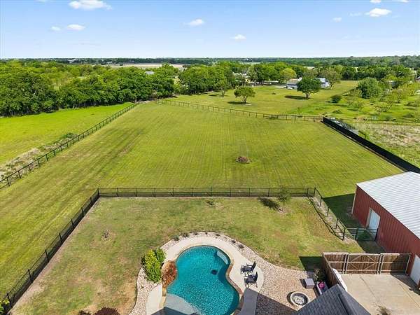 Welcome HOME to 3858 Chelsea Way, where country living meets everyday convenience. Nestled on a quiet cul-de-sac and surrounded by mature trees, this property offers a peaceful setting outside city limits with all the charm of rural living. Enjoy the freedom and flexibility that comes with this beautiful farmhouse-style home, complete with a wraparound porch, barn doors, natural wood trim, and a decorative stone fireplace that anchors the main living space. This spacious home features 6 bedrooms, 2.5 bathrooms, and a versatile media or flex room. The primary suite is generously sized and offers an ensuite bath with separate his-and-her vanities, a soaking tub, and a separate shower. Secondary bedrooms are well-appointed, including a Jack-and-Jill bathroom with walk-in closets, providing both comfort and functionality. The kitchen is designed for gathering and everyday living, featuring a large island, bar-top seating, and abundant cabinet space. A spacious laundry room with utility sink adds convenience. Two additional secondary bedrooms are located upstairs, offering flexibility for guests, office space, or multi-generational living. Step outside to enjoy a covered back patio with extended patio addition, perfect for entertaining. The backyard oasis features a waterfall feature, swimming pool and fire pit, creating an inviting outdoor retreat. The property is fully fenced and includes a 36x40 insulated shop with two horse stalls, ideal for hobbies, storage, or livestock. Experience the perfect blend of country charm, space, and functionality, all while remaining conveniently located to nearby amenities and major roadways. NO HOA! NO CITY TAXES!
