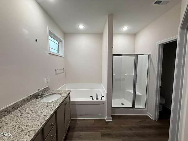 - Bathtub/Shower Combination, Ceiling Fan(s), Granite Counters, Primary Downstairs, Separate Shower, Smooth Ceilings, Soaking Tub, Tray Ceiling(s), Walk-In Closet(s), Walk-In Shower