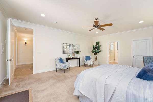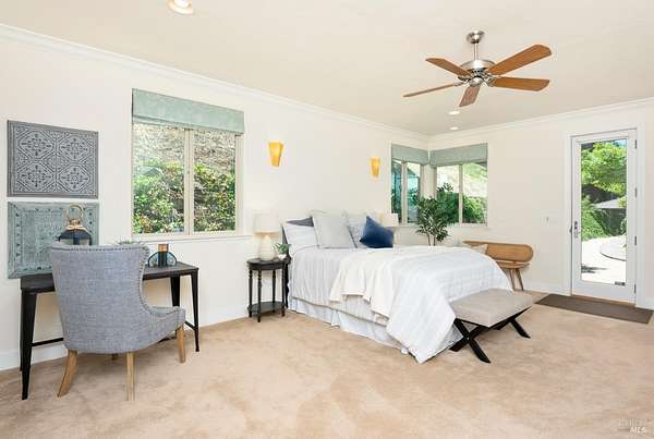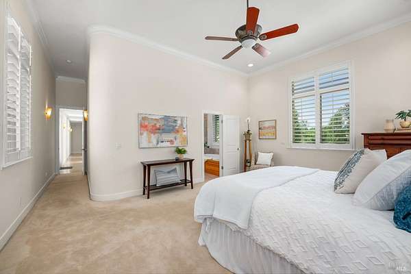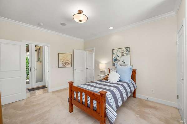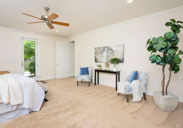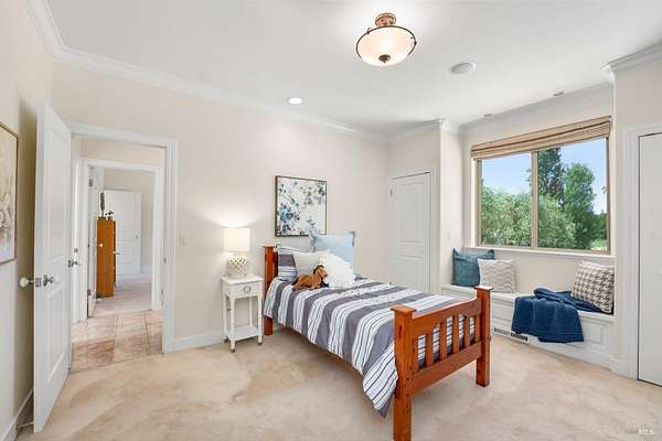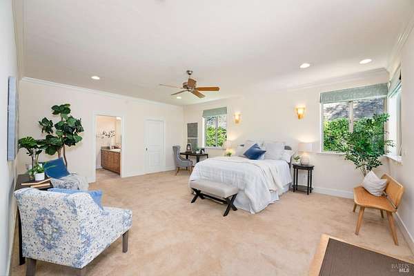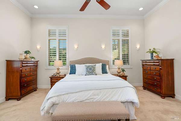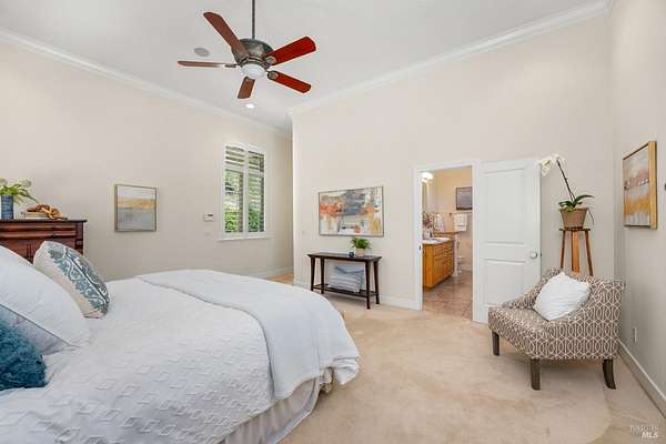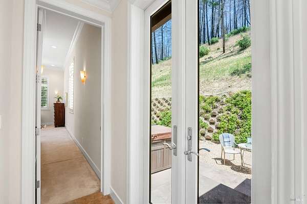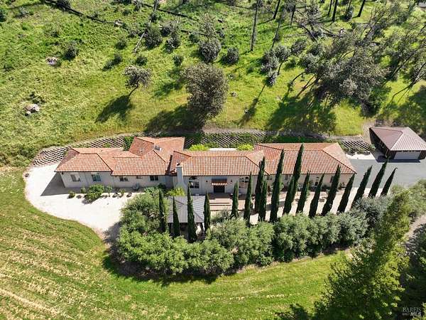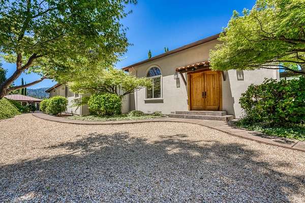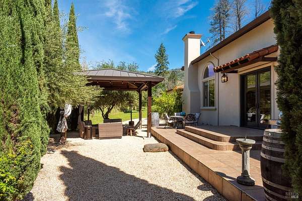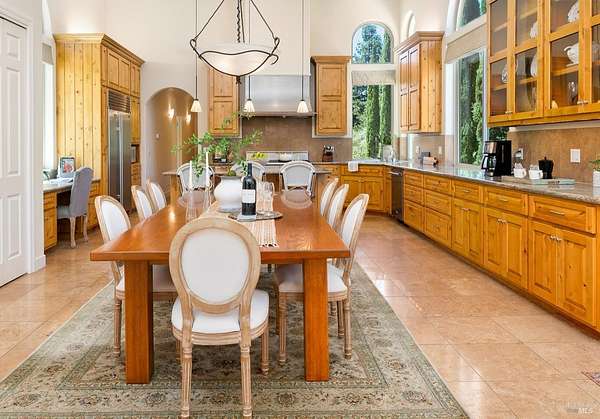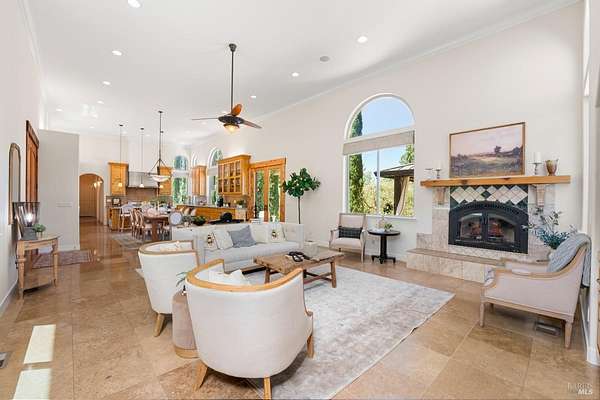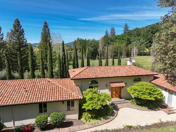 This sprawling, single-level, 3,477 sqft, villa features 14 foot high cathedral ceilings, 5 bedrooms, 4 bathrooms, and an open floor plan. Chef's kitchen offers a Viking range with custom-built stainless hood, trimmed in copper and Sub Zero fridge with cabinet front and travertine tile flowing from the kitchen through the spacious great room. Guest suite is almost as luxurious as the primary suite with its own private entrance. The exterior features stucco facade, terracotta barrel roof tiles, and arched windows. Nestled between St. Helena and Calistoga. Electric gated entry and gate house, this villa also has a two-car garage, and additional detached two-car garage with conditioned wine storage room. Back-up power generator and water conditioning system. Room for a pool and view of the neighboring vineyards, this Villa embodies classic Wine Country Living.