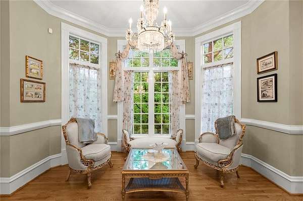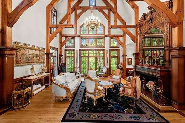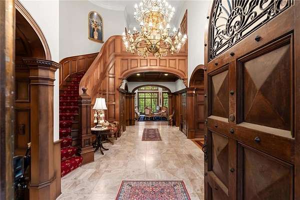"The LION Manor"- Majestic Estate Inspired by the Castles of England and Scotland - Sale Includes Adjoining Lot - two parcels! Bordering the National Park and nestled beside scenic Sope Creek, this breathtaking estate draws inspiration from the timeless castles of England and Scotland. Meticulously crafted over three years, this architectural masterpiece combines old-world grandeur with modern luxury and includes the adjoining lots for added privacy and expansion potential. From the moment you enter, you're surrounded by masterful details: rare Honduran mahogany, hand-carved doors, antique imported mantels from 200-300-year-old English manors, and European chandeliers throughout. A soaring 25-foot Great Room with hand-hewn beams offers a dramatic central gathering space, while the richly paneled Library/Office and elegant Dining Room with fabric-paneled walls exude character and sophistication. The gourmet Kitchen features a large island, walk-in Pantry, Butler's Pantry, and a cozy Keeping Room with fireplace, all opening into a Breakfast Room with tranquil views of the natural beauty of Sope Creek. A main-level Suite with fireplace provides comfort and privacy for owners or visitors. The grand two-story Entry Foyer features a sweeping mahogany staircase, complemented by a rear staircase accessing all levels. Upstairs, the expansive Second Primary Suite includes its own fireplace and private Laundry, along with two additional ensuite Bedrooms. A private hallway leads to the Carriage House, offering independent living space complete with Living Room, Kitchen, Bedroom, Bathroom, and Laundry. Two lower levels overlook a show-stopping, two-story Recreation and Gaming Hall featuring a massive 30-foot stone fireplace-perfectly suited for entertaining, art displays, or hosting grand events. The home is elevator-ready, with a shaft already in place, and includes existing plumbing for a future pool featuring cascading waterfalls from the main house. Car enthusiasts and collectors will appreciate the oversized five-car Garage, with two climate-controlled bays and generous storage. The Carriage House is accessible via an interior staircase for convenience. This one-of-a-kind estate was constructed with only the finest materials and an uncompromising attention to detail. It's more than a home-it's a legacy property, ready for you to make your own. Note: Bedroom/Bathroom count includes 1BR/1BA in the Carriage House Apartment. Pool design plans available.