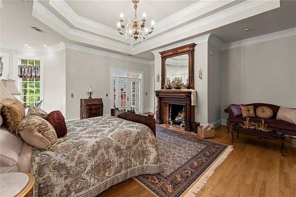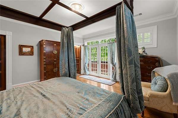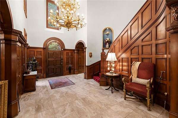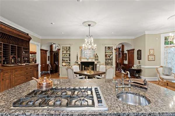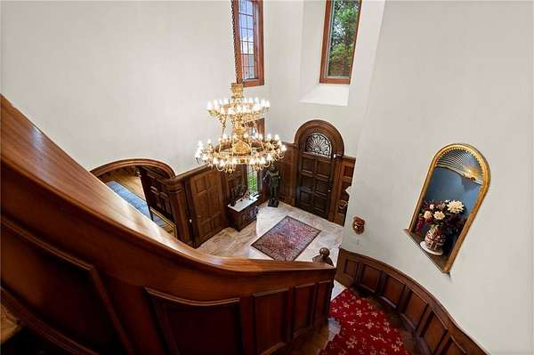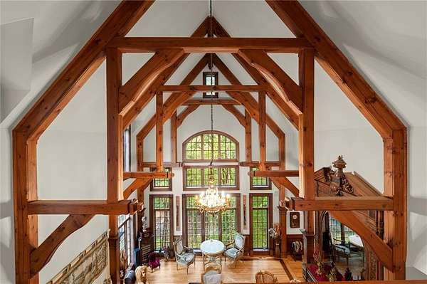 From the moment you enter, you're surrounded by masterful details: rare Honduran mahogany, hand-carved doors, antique imported mantels from 200-300-year-old English manors, and European chandeliers throughout. A soaring 25-foot Great Room with hand-hewn beams offers a dramatic central gathering space, while the richly paneled Library/Office and elegant Dining Room with fabric-paneled walls exude character and sophistication.
