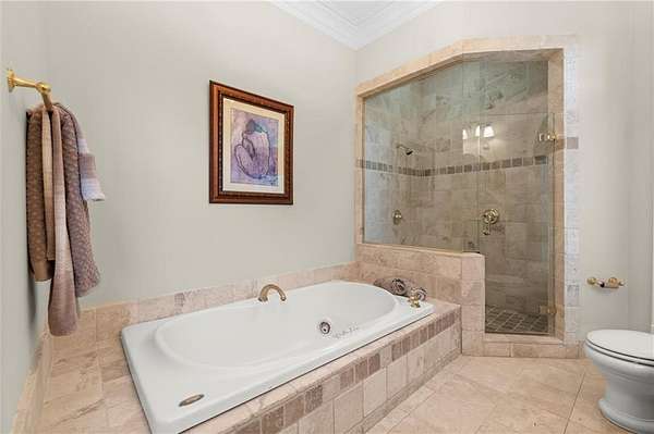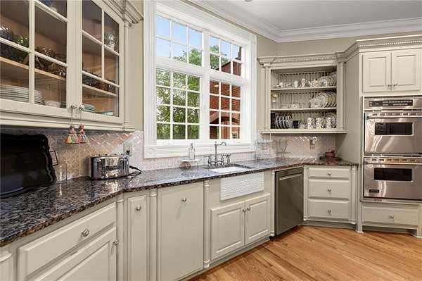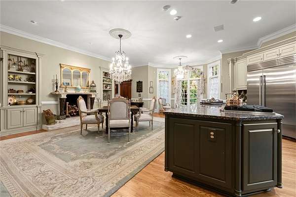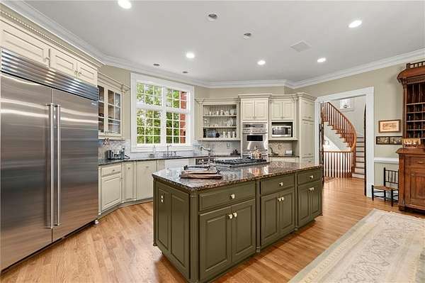 The gourmet Kitchen features a large island, walk-in Pantry, Butler's Pantry, and a cozy Keeping Room with fireplace, all opening into a Breakfast Room with tranquil views of the natural beauty of Sope Creek. A main-level Suite with fireplace provides comfort and privacy for owners or visitors.