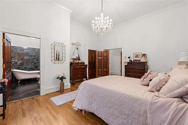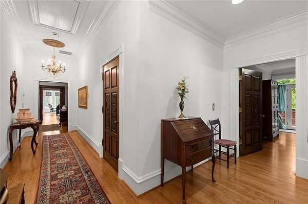 The grand two-story Entry Foyer features a sweeping mahogany staircase, complemented by a rear staircase accessing all levels. Upstairs, the expansive Second Primary Suite includes its own fireplace and private Laundry, along with two additional ensuite Bedrooms. A private hallway leads to the Carriage House, offering independent living space complete with Living Room, Kitchen, Bedroom, Bathroom, and Laundry.