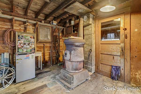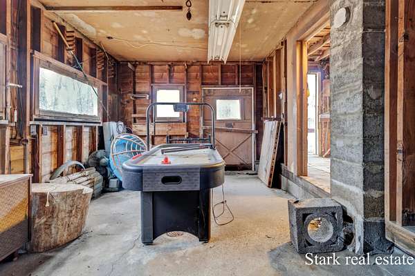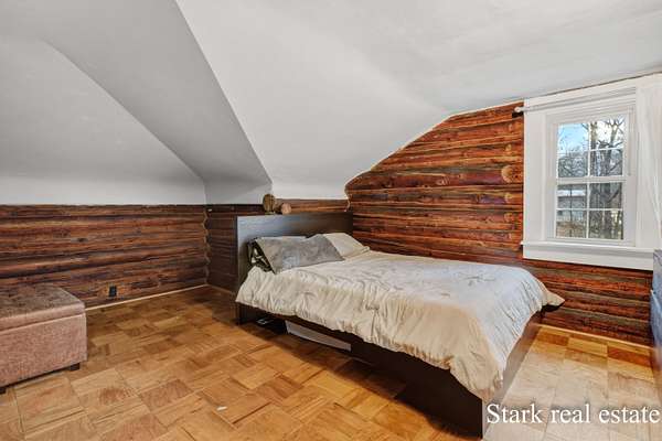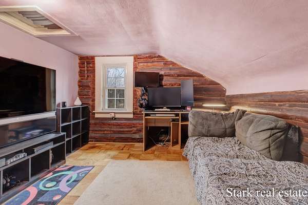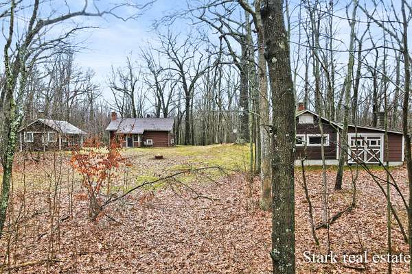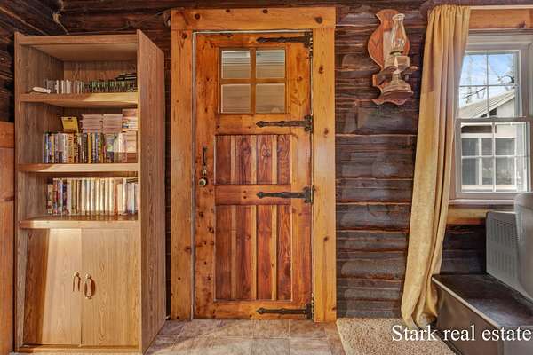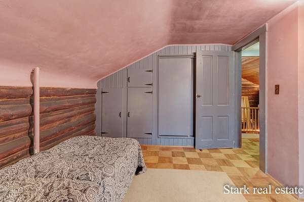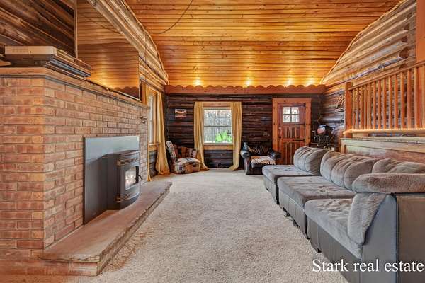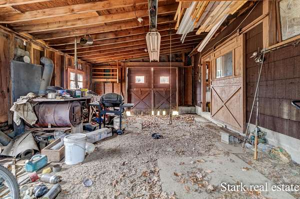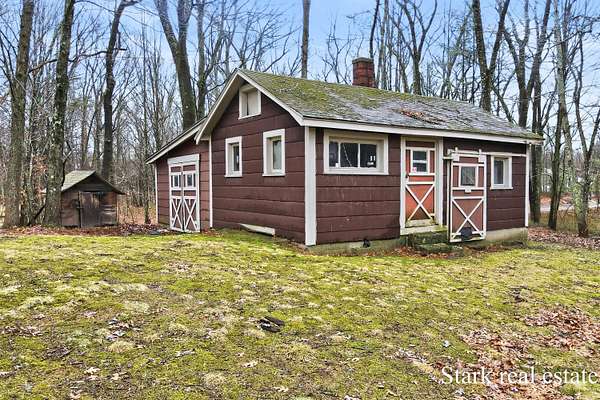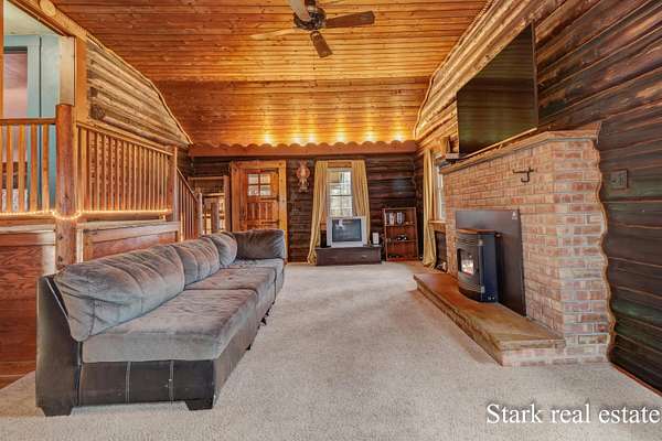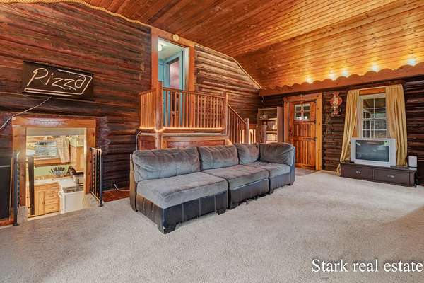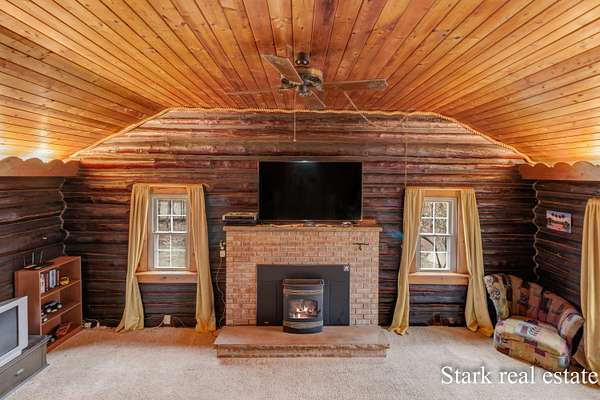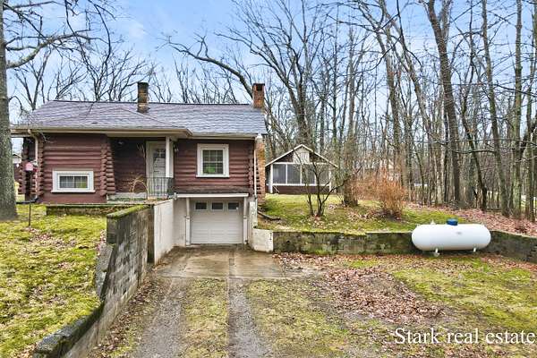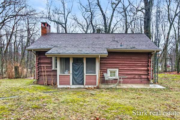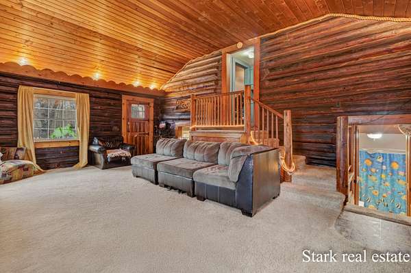 This Reeths-Puffer log home is a unique design and you must get inside to see it's craftsmanship. Offering privacy on 5 acres, and well off the road with a circle drive. There is a pellet stove insert in the living room that heats the whole house all winter. Inside are 3 floors with living room, 2 bedrooms on the upper floor, and main floor with eat-in kitchen, bathroom, and entry way just in from the attached garage. Cabin style feel inside with log walls, knotty pine ceiling and natural wood throughout. Underground, beneath the garage is a hidden bomb shelter custom-built with potential for many additional uses. Outside is a covered screen room perfect for entertaining, and a bonus storage shed with a workshop area. Wooded setting and just minutes from Lake MI, Muskegon Lake, and Muskegon State Park. Schedule your private showing today!