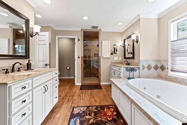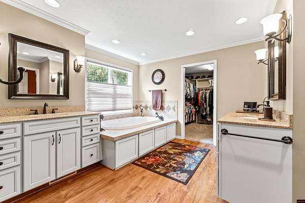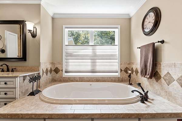 - Carpet, Ceiling Fan(s), Garage Door Open, Laminate Floor, Split Bedroom Plan, Tile Floors, Walk in Closet, Whirlpool Tub