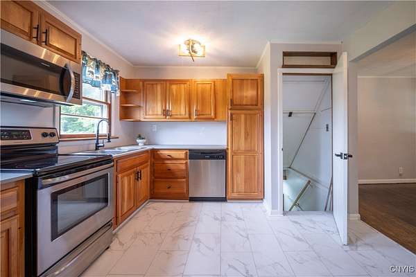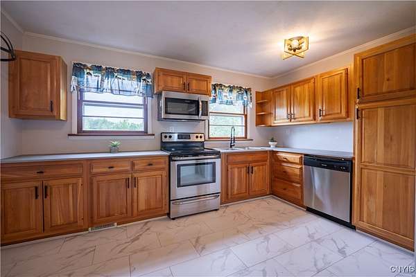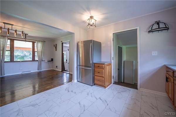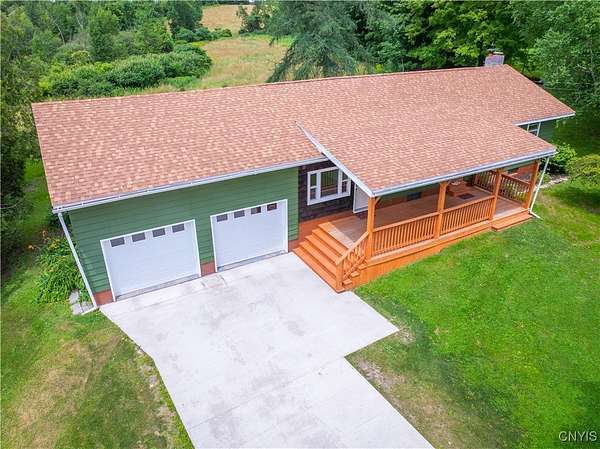 Welcome to 387 Brennan Road, a tastefully updated ranch that combines modern comfort with easy, single-level living. Nestled on a 2.44 acres, this well-maintained home offers 3 bedrooms and 1.5 bathrooms, providing plenty of space whether you're starting out, downsizing, or simply looking for a move-in ready property. Step inside to discover bright, inviting spaces with fresh finishes throughout. The heart of the home is the beautifully renovated kitchen, featuring newer cabinetry, updated countertops, and modern appliances that make cooking and entertaining a joy. Just off the kitchen, the open dining area and living room create a welcoming space to gather with friends and family. A standout feature of this home is the spacious bonus room, currently outfitted with a pool table-perfect for game nights, casual entertaining, or relaxing with guests. This flexible space could also serve as a second living area, media room, or hobby space, offering even more room to enjoy. A full bathrooms have been thoughtfully updated with contemporary fixtures and finishes, giving the home a clean, refreshed feel. Three comfortable bedrooms offer flexible options for family, guests, or a dedicated home office. Outside, you'll enjoy a manageable yard with room for gardens, play space, or outdoor relaxation. The large two-car garage provides excellent storage for vehicles, tools, and hobbies, with additional driveway parking as well. Located in a peaceful, established neighborhood, 387 Brennan Road is just a short drive to Ilion's shopping, schools, restaurants, and conveniences. All the work has been done-newer kitchen and baths, numerous updates throughout-so you can move right in and start enjoying your new home. This is a fantastic opportunity to own a well-cared-for ranch with modern upgrades, classic charm, and bonus space for recreation or relaxation. Come see everything this wonderful property has to offer!