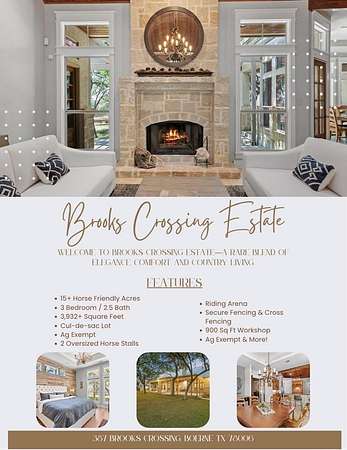 BROOKS CROSSING ESTATE - Offers the epitome of style, quality and craftsmanship wrapped up in a stunning custom-built home featuring 3 bedrooms and 2.5 baths, this 3,932+ square-foot masterpiece sits at the end of a quiet cul-de-sac on 15 horse friendly acres, surrounded by abundant majestic oak trees and beautiful landscaping, making for an ultimate private feel. Step inside and you're welcomed by exquisite beauty and a warm charming atmosphere at every turn. Beginning with soaring wood-beamed vaulted ceilings and rich wood accents that flow seamlessly from room to room, lending warmth and character throughout. The impressive entryway, flanked by grand stone pillars, leads you into a charming great room anchored by a floor-to-ceiling stone fireplace and expansive windows that bathe the space in natural light while showcasing breathtaking backyard views. The gourmet kitchen is a dream for entertaining, equipped with top-of-the-line appliances, a spacious island, deep sink, under-cabinet lighting, gleaming granite countertops, and an oversized walk-in pantry. Custom alder wood cabinetry provides ample storage, and the kitchen flows effortlessly into the dining area w/ built in serving station-an ideal spot to enjoy meals overlooking the majestic trees and acreage out back, with direct access to the back patio for seamless indoor-outdoor living. The spacious master suite encompasses an entire wing of the house and is a perfect blend of style and utility complete with a striking wood accent wall, intricate pan ceilings, beautiful views outside, and direct access to the outdoor living area. The spa-inspired ensuite bathroom features a Jacuzzi soaking tub, walk-in shower, huge roomy walk-in closet and his/her vanities uniquely designed with granite countertops and tons of hardwood custom cabinetry and storage. A well thought out split floor plan places the two additional guest rooms just down the hall. Both guest bedrooms are cozy and inviting, complete with tall vaulted ceilings, abundant natural light and generous walk-in closets, connected by a large Jack-n-Jill bath that offers separate rooms with their own vanities and a shared shower/tub. In addition, the home includes a spacious utility room with tons of storage and cabinetry, a large utility sink along with an office that can be easily converted to a 4th bedroom. But wait there is more! Off the kitchen, you'll find a cozy den with vaulted wood ceilings and a stylish powder bath, which opens into a huge family room--perfect for game nights, movies, or relaxing with friends and family. OUTSIDE - step outside to the expansive patio where you will spend a lot of your time sitting and enjoying the deer, birds and other wild life underneath a bed of oak trees. Multiple doors connect the patio to the living and kitchen areas, making this home perfect for entertaining. There's also a well-equipped well house with electricity, offering extra storage options along with an over-sized 3 car garage, giving extra space for off-road vehicles, motorcycles or storage. The landscaping includes automatic sprinkler system and lighting. Horses are welcome. A perfect spot for the equestrian lover! This property comes equipped with excellent horse facilities including 2 oversized horse stalls, a riding arena, and secure fencing and cross fencing. A 900 square-foot workshop with AC is ideal for woodworking, car enthusiast or any hobby you can imagine. Whether your passion is horses, livestock, or simply enjoying nature at its finest, this property has room for it all. Welcome to Brooks Crossing Estate--a rare blend of elegance, comfort, and country living.