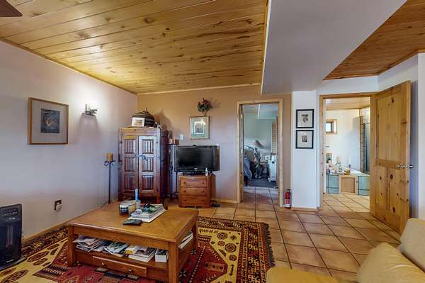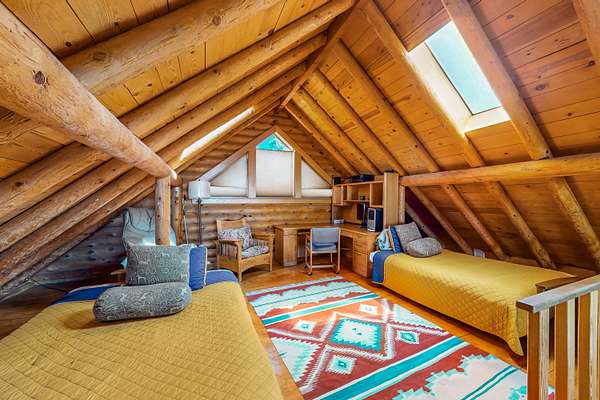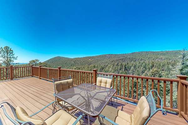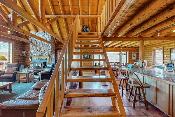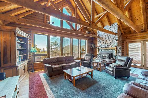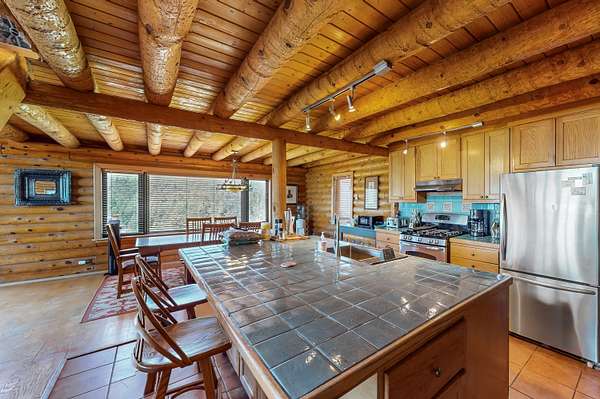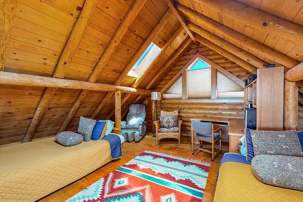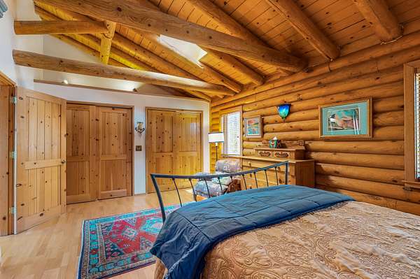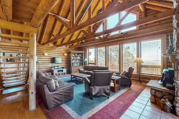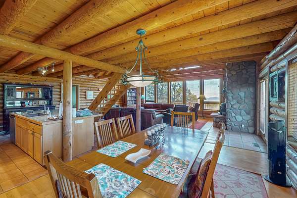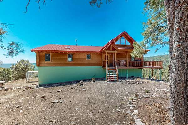 Stunning and unique log cabin home surrounded by 9 Acres in the Pecos wilderness. The main home has an open floor plan with a magnificent stone fireplace, hard wood floors, 5 bedrooms, large eat in kitchen with tons of cabinets & counter space, a cozy loft space and huge wrap around deck with spectacular views over Glorieta Mesa. The home includes a fully functioning one bedroom apartment on the lower level as well as a separate studio/workshop that could be used as more space, storage, etc. Enjoy the wilderness and wildlife, beautiful sunrise and sunset views, hiking trails, the quiet peace and crisp clean air of the New Mexico countryside, Only 45 minutes from Santa Fe, this property offers a very private location that is perfect for a home away from the hustle and bustle of city life.