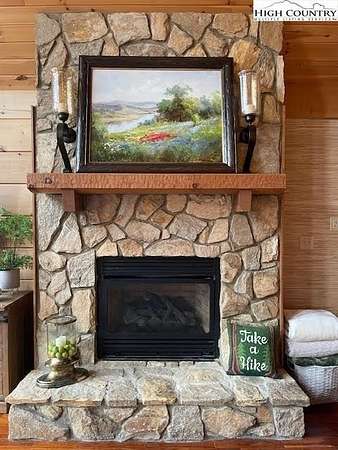 Exceptional mountain log cabin, offering over 2,600 square feet of professionally designed living space. This 3-bedroom, 3.5-bathroom home features an open floor plan with vaulted ceilings, exposed beams, and rustic finishes for a premier mountain living experience. The main level includes a primary suite with a stone fireplace and a private en-suite featuring dual vanities and a jetted tub and access to the back deck. The vaulted living room with exposed beams offers a bright, open layout with a second stone propane fireplace and access to a back deck with mountain views and a propane fire pit for those chilly days. The kitchen is fully equipped with stainless steel appliances, granite countertops, stone accents, and ample cabinetry and counter space and provides direct access to the laundry room. Dining room is spacious and offers extra seating at the breakfast bar. You will find sliding doors leading to the back deck for dining outdoors and grilling. The upper level offers two additional spacious bedrooms and a full bathroom. The lower level includes a second living area with a wet bar, a full bathroom, a large bonus room, and access to both the lower deck and a two-car garage. Additional highlights include: - Professional decorated interior and furnished- High-end textures: cherry wood floors, grass cloth wallpaper, and stone accents- Tiled showers and dual vanities- Spacious foyer and covered entryway - Ample parking with two driveways (one private to the lower garage and one shared to the main entrance)