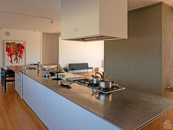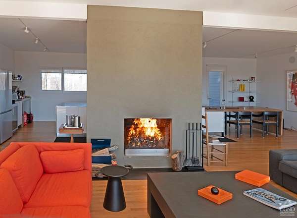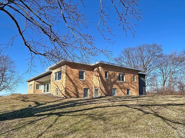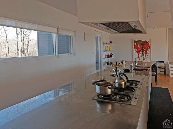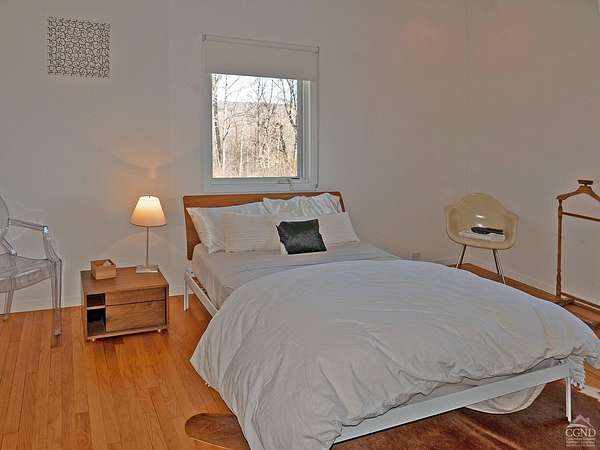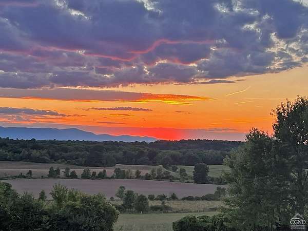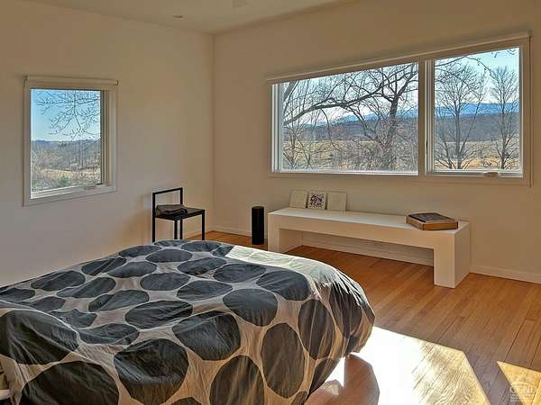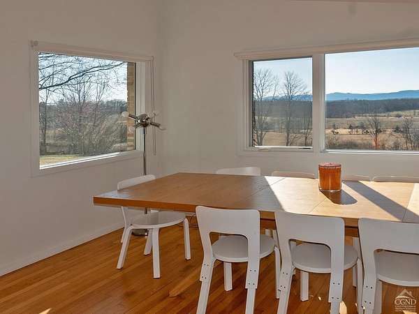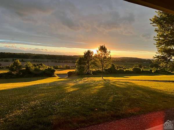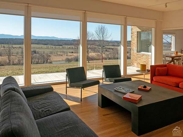 Enjoy this impressive Mid-Century Modern home, now available year-round. Built in 1957, to the highest standards, this completely updated home has been stylishly renovated and furnished by the new owner (a prominent professional design expert) using the best interpretation of mid-century modern style. Located high above a quiet country road, chosen for outstanding Catskill views and overlooking open farm fields bordered by hedge rows with mature trees, the home's new energy-efficient windows have been strategically expanded to bring inside the spectacular outside views. The original separate core living room, kitchen and den of the house have been combined to a huge open space around the impressive wood-burning fireplace with floor-to-ceiling windows to the west, a huge central kitchen island and breakfast area behind the fireplace. All walls, ceilings, doors, windows have been refurbished with bright, clean, sleek surfaces and the original oak floors were restored in all the rooms. The primary bedroom (with fresh modern ensuite bathroom) has the expansive westerly views while the two guest bedrooms share another modern bathroom and have south and east views of the surrounding woods and fields. On the lower level are storage and playrooms, complete with ping pong and foosball tables, a long wall of bookshelves, and the utility room with up-to-date equipment, including water filters, geothermal energy and air exchange systems that provide sustainable clean and healthy heating and cooling. The property, with five private country acres, is just down the road from Columbia Golf and Country Club. Only ten minutes to thriving Hudson with restaurants, shops, and galleries, it is just two hours to NYC by car or Amtrak.
