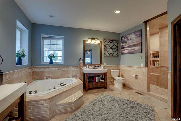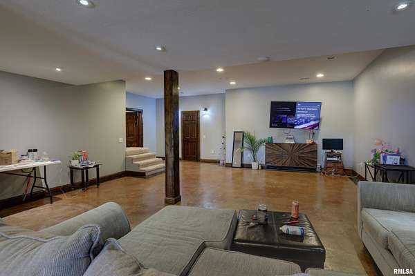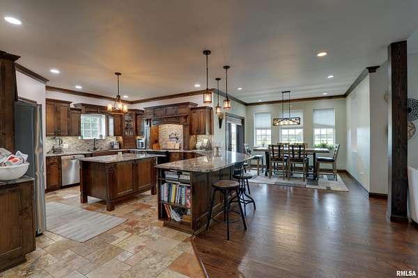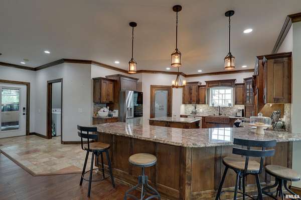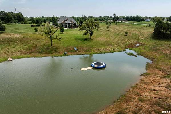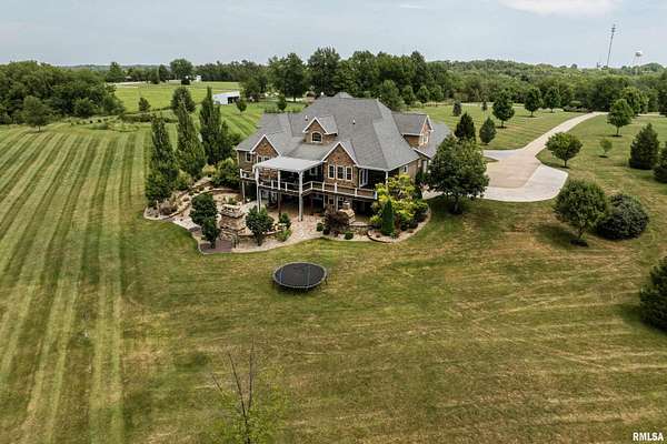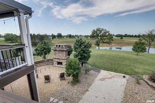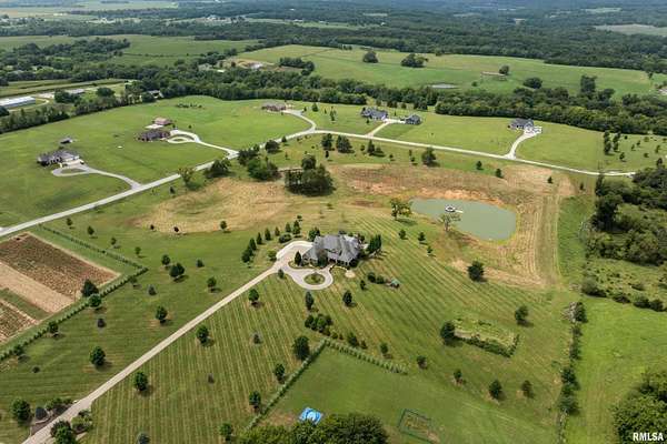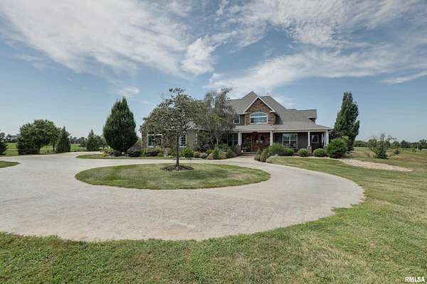 Welcome to your private sanctuary in sought-after Palmyra, MO! This magnificent 5 bedroom, 3 full and 2 half bath home offers over 6,400 sq ft of luxury living with the perfect blend of elegance and comfort. Arrive by a long private drive to a stately covered porch and beautifully landscaped grounds. Inside, a grand 2-story foyer sets the tone with a formal sitting room, expansive living space with soaring windows, and a cozy fireplace. The Tuscan-inspired kitchen is a chef's delight, featuring stone countertops, custom range hood, stainless appliances, a central island, and walk-in pantry. The master suite (14x25) lives like a private retreat with a spa-like bath boasting dual vanities, whirlpool tub, massive tiled shower, and an 8x17 walk-in close, while the upstairs offers 3 additional bedrooms, including one en suite, a shared full bath, and a versatile recreation room. The walkout lower level features a spacious family room and an additional bedroom with private entry--ideal for guests or multigenerational living as well as a convenient finished 4th garage currently being used as a home gym. But the real magic happens outside! Set on 8.1 acres with a private lake, the outdoor spaces impress with nearly 1,200 sq ft of covered porch, and a lower-level stone patio with a fireplace, an outdoor kitchen, and a pizza oven. An additional 5 acres is available for purchase as well. Don't miss this rare chance to own your dream home where every day feels like a vacation!
