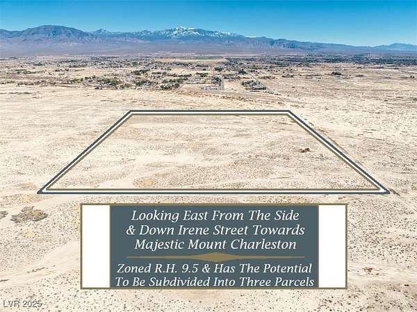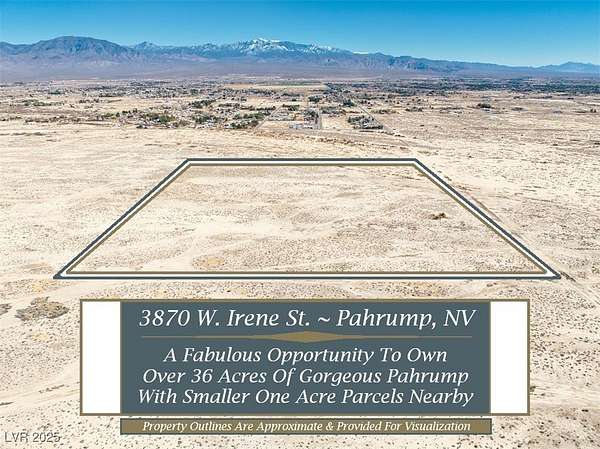 Nicely Nestled Near The Base Of Pahrump's Western Mountains Is Where More Than 36 Acres Of Pristine Property Awaits You~~~Priced Wonderfully At Less Than $10,000 Per Acre, 3870 W. Irene St. Offers Beautiful Views, Wide Open Spaces & More Than 1.5 Million Sq. Feet For Your Pahrump Plans~~~The Property Is Zoned For Private Well Septic With Power Located Nearby On Murphy St. & Irene St.~~~These Extra Large Parcels In This Area Are Zoned R.H. 9.5 & Can Possibly Be Subdivided Into Three Separate Parcels~~~Located Less Than 15 Minutes From The Center Of Town, About An Hour From Las Vegas, This Property Allows You To Be A World Away While Still Enjoying Modern Day Convenience & Activities~~~The Seller Will Finance (If Needed) With A Third Down Or Ask About Lenders That Are Now Offering Land Loans~~~This Is A Fantastic Opportunity To Secure An Extra Large Parcel For A Great Price, Make It Yours!