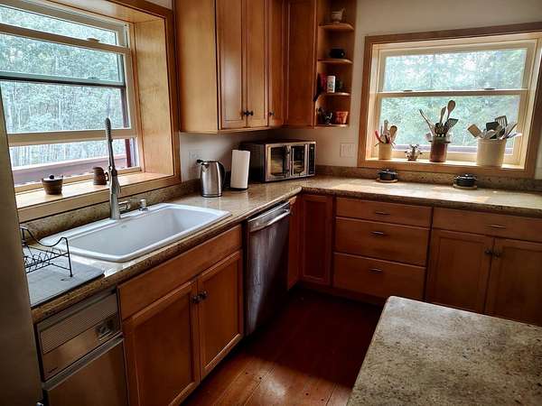 Introducing 3872 Frenchman Road, a Rustic Style 3 Bedroom 2 and 1/2 Bath Double Car Garage Home with a Gambrel Style Metal Roof just off Spinach Creek Road. This secluded Multilevel home is tucked away on 5.5 acres of Wooded Hillside Property. The Main Level features an Arctic Entry with access from the Garage along with both the Front and Back of the Home, Half Bath, Dining Room, Living Area with Cathedral Tonge & Groove Ceiling & Wood Stove. This Open Concept Kitchen Boasts DeWils Cabinets with Soft Close Doors & Drawers and lots of Storage, Abundant Solid Surface Granite Counter Tops, Gas Range, Double Ovens and a Pantry. The Living Room has South Facing Windows and access to the massive Wrap Around Deck. The Upper Level is open to the main Level with Cathedral Tongue and Groove Ceilings, a Sitting Room that could be used as an Office, Den or Reading Room and the Master En Suite Bedroom with Walk-In Closet. The Large Master Bathroom has a Tub with Shower, Toilet and Double Sinks. The Upper Level of this Home also includes a Large Bonus Room over the Garage that could have many possible uses and is plumbed for a Sink with seperate access from the outside. The Lower Walk Out Level has 2 Bedrooms a Full Bathroom, Furnace Room, Laundry Room with a Laundry Shoot from the Upper Level Bathroom and 2 Large Pantry/Storage type rooms. The Hardwood Flooring is Old Fir Wide Board & Pegged style flooring. The ceiling and walls are accented with Pine Tongue & Groove. Home Boasts a Large Three Quarter Wrap Around Deck to BBQ, Entertain or Just Relax & Enjoy the Alaskan Summer & Winter Northern Lights. The Heavily Treed property has a black top driveway leading up to the house along with a Mid Level area where a Dry Cabin used to be that could be used as a Vehicle or RV parking area. Home has Newer Double Pane Windows and 17 inch Thick Walls Motivated Seller, Possible Flooring or Closing Credit negotiable with an offer. New 4 Bedroom Septic System just Installed 07-25. Please Bring All Offers!