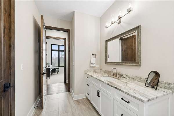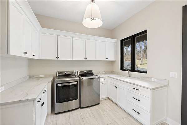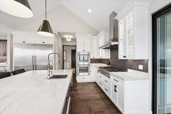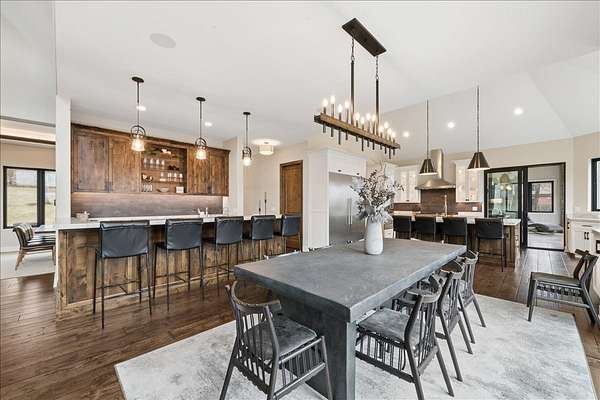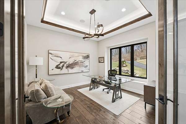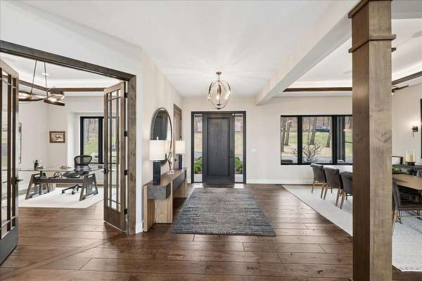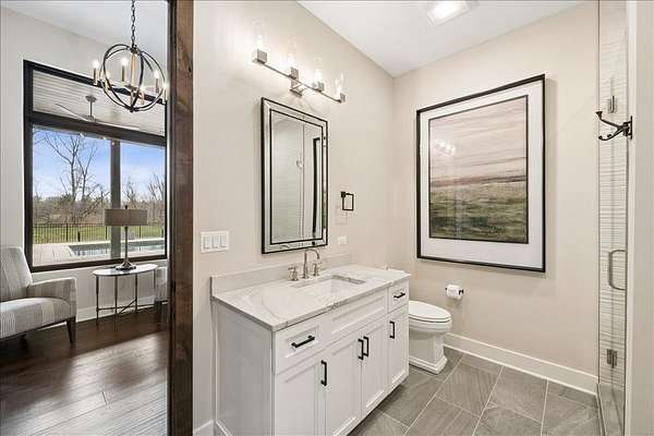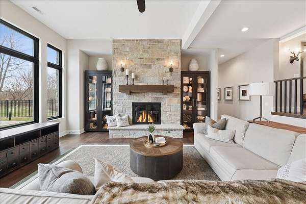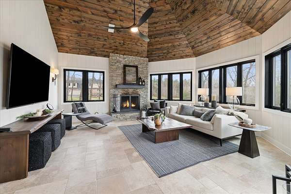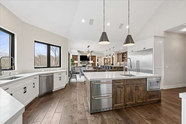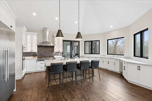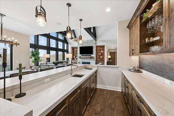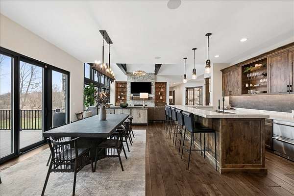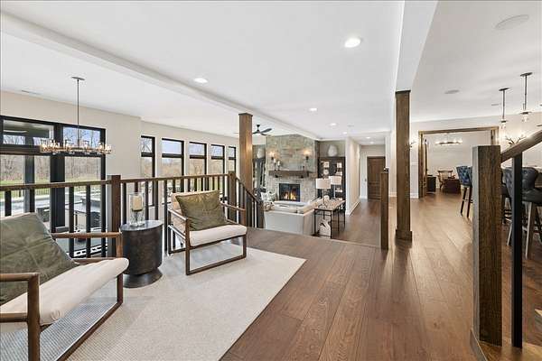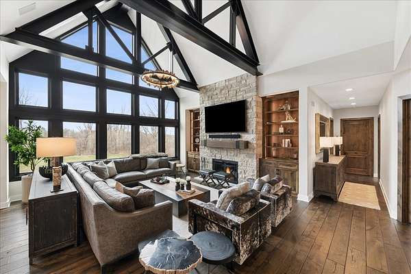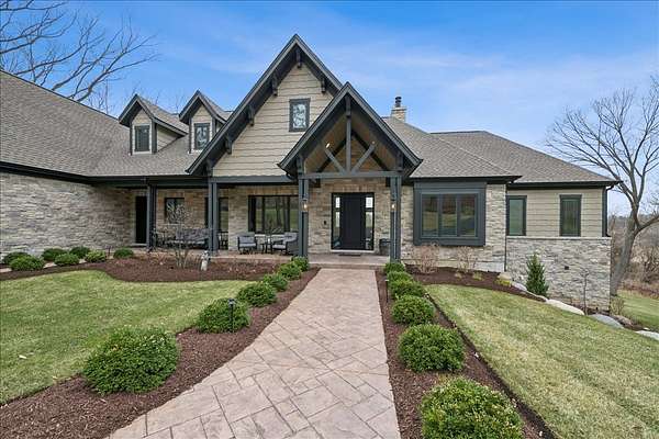 This exceptional custom-built estate, completed in 2022, sits on 2.25 private acres and is designed to impress at every turn. Offering 4 bedrooms and 4.1 bathrooms, the home showcases meticulous craftsmanship, premium materials, and a layout ideal for both everyday living and large-scale entertaining. Highlights include a dramatic vaulted living room with custom steel beams, wide-plank hand-scraped oak floors, and a chef's kitchen with Thermador appliances, oversized island, walk-in pantry, multiple dining areas, and a full bar setup. The main-level primary suite is a true retreat with spa-inspired bath, heated floors, soaking tub, and dual walk-in closets. Additional features include a three-season room with fireplace, elevator access to all levels, heated 4-car garage with extensive storage, and a lower-level entertainment space with bar, cigar room, guest bedrooms, and full bath. Luxury living extends outdoors with a heated saltwater Gunite pool and spa, covered patio with bar, professional landscaping, and even a private 3-hole golf course. Surrounded by wooded views and protected land, this one-of-a-kind property offers rare privacy, luxury, and lifestyle.