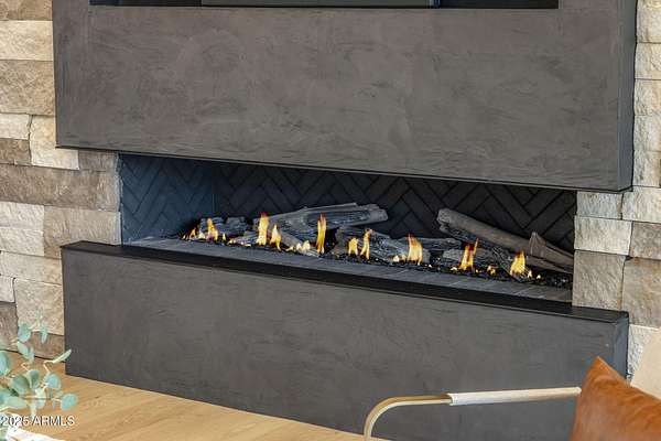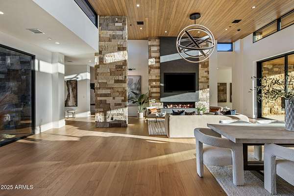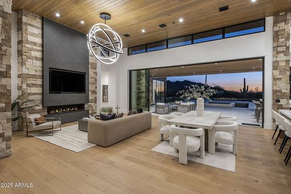 Outdoor living is reimagined with covered patios, a sparkling heated pool and spa, a gas fireplace and fire pit, and an outdoor barbeque perfect for evenings under the Arizona sky. Floor-to-ceiling glass blurs the line between indoors and out, inviting natural light and panoramic views into every space.